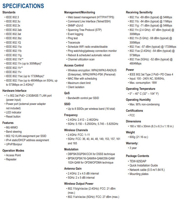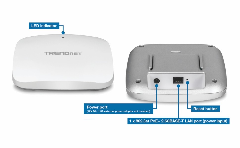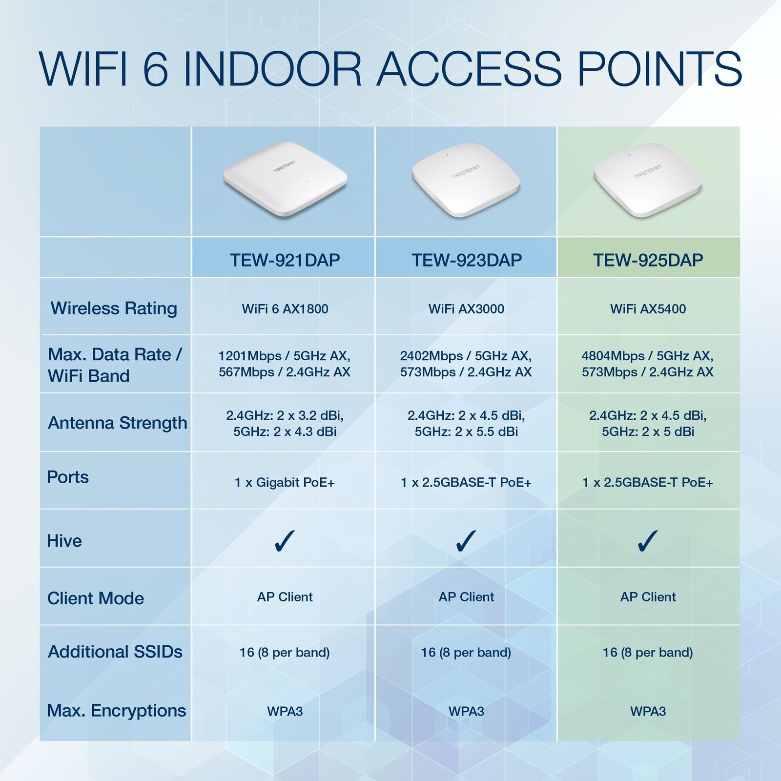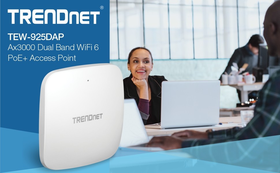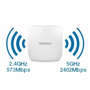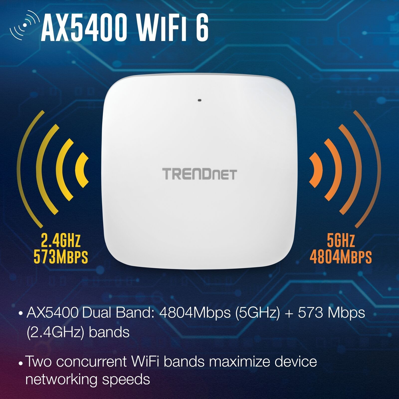 TRENDnet’s high-performance AX5400 Dual Band WiFi 6 PoE+ Access Point, model TEW-925DAP, features two concurrent WiFi bands to maximize networking speeds with the latest WiFi 6 technology. The two separate high-speed WiFi 6 bands provide speeds up to 4804Mbps on the 5GHz band and 573Mbps on the 2.4GHz band. The WiFi 6 access point also supports Access Point (AP) and Repeater modes.