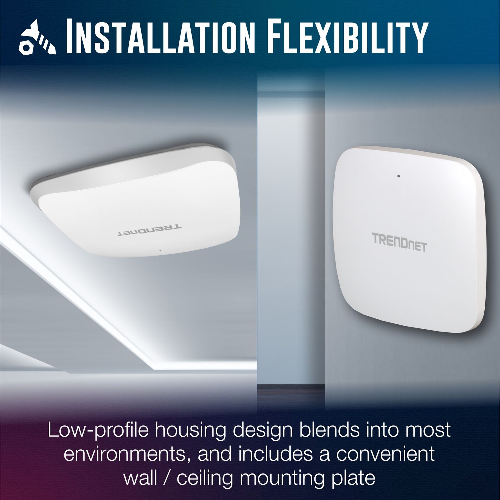 Faster speeds are possible on this WiFi 6 access point with 1024-QAM, OFDMA, and MU-MIMO technologies. MU-MIMO technology processes multiple data streams simultaneously, increasing real-time WiFi performance when multiple devices access the network. The wireless access point features access control, bandwidth control, and band steering. The low-profile housing design blends into most environments, and includes a convenient wall / ceiling mounting plate.