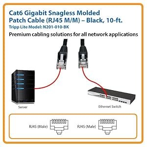 For peace of mind, this 10 feet Tripp Lite Cat6 Gigabit Snagless Molded Patch Cable comes backed by a lifetime warranty. The N201-010-BK is manufactured in compliance with strict RoHS specifications, reflecting Tripp Lite’s commitment to environmental responsibility.