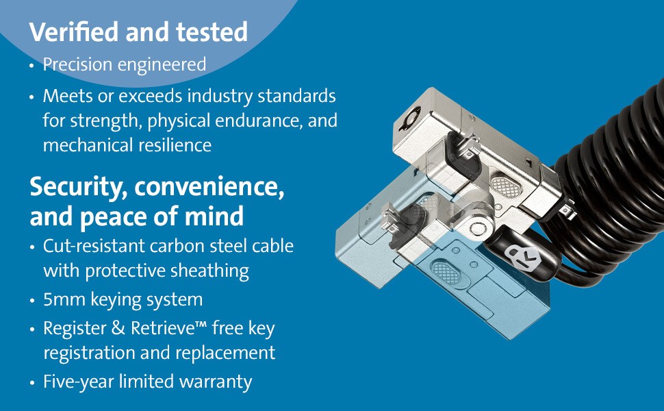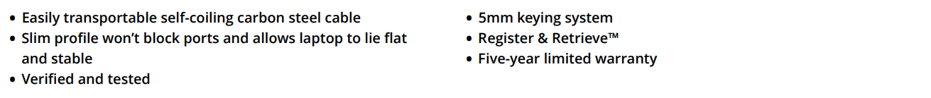 the laptop itself. This prevents the device from lying flat on a surface, making the keyboard and trackpad uncomfortable to use. With connectivity ports placed closer and closer together, a standard lock can also block adjacent ports, compromising functionality. A re-designed version of the innovative Slim NanoSaver® Laptop Lock, the Slim NanoSaver® 2.0 Portable Keyed Laptop Lock features a smaller lock head, with the locking cleat positioned low, and the key cylinder up high and out of the way. This careful sizing and positioning of components has created a premium locking solution that won’t block ports and allows ultra-thin and 2-in-1 laptops with nano lock slots to lie flat and stable. A self-coiling carbon steel cable stretches up to six feet (1.8m) and shrinks down to three inches (76mm), making this lock easily transportable. Strength tested and verified for industry-leading standards in torque/pull, foreign implements, lock lifecycle, corrosion, and other environmental conditions, the lock is backed by a five-year limited warranty, so you can rest assured knowing you’re covered by Kensington, inventor and a worldwide leader in laptop security locks.