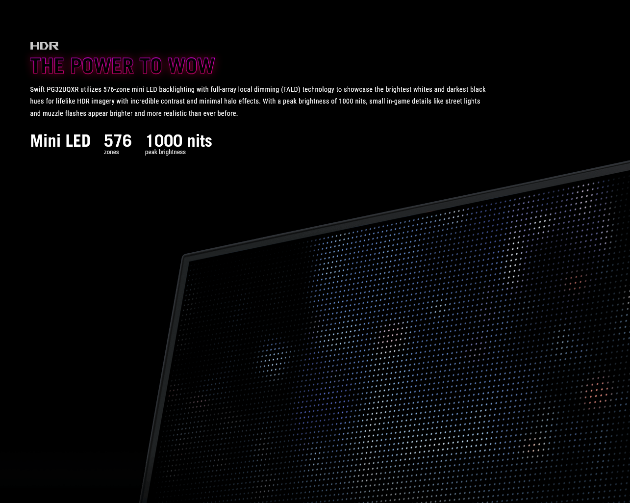 - Full Array Local Dimming (FALD) backlight delivers 576 independent LED zones and peak brightness 1000 nits with DisplayHDR 1000 certification