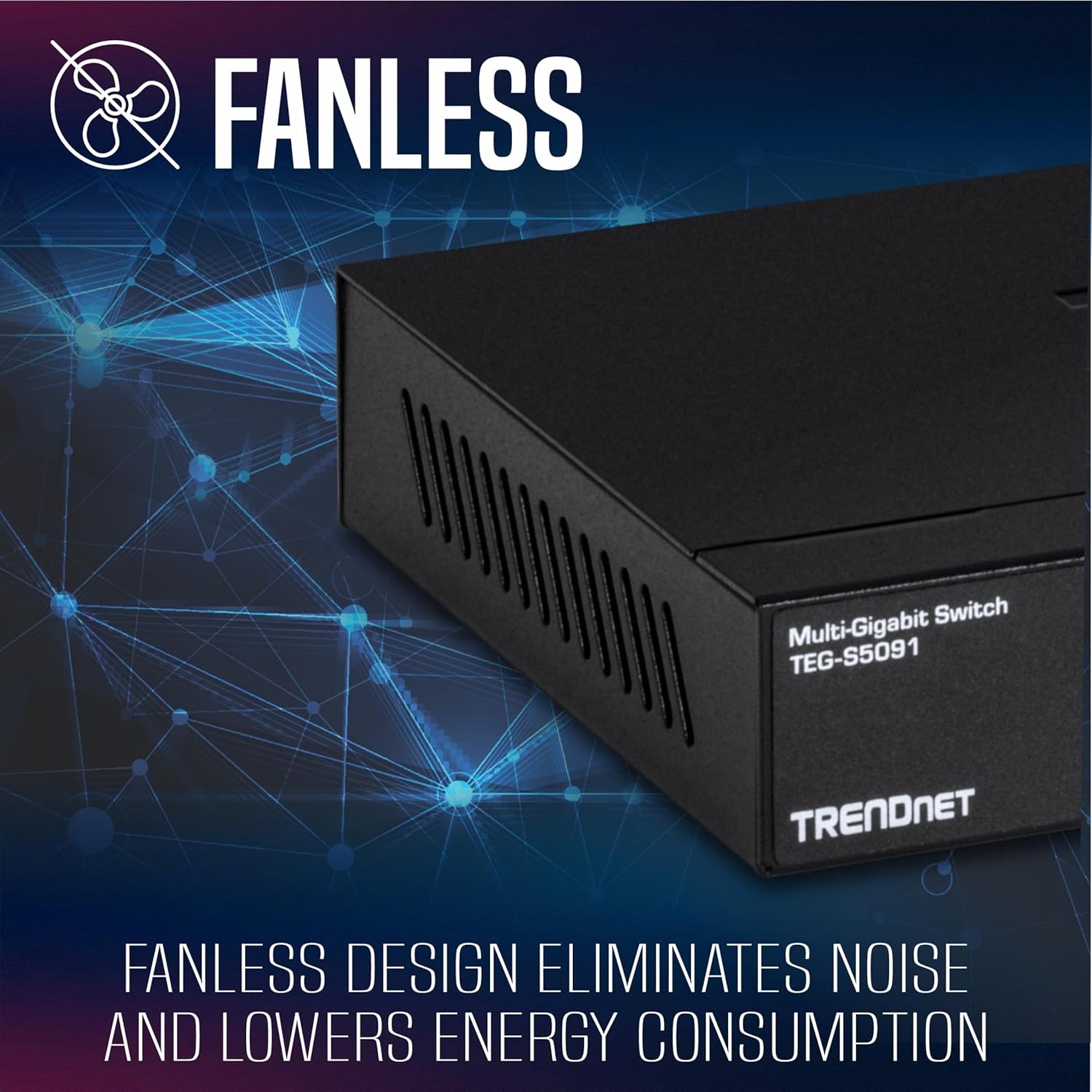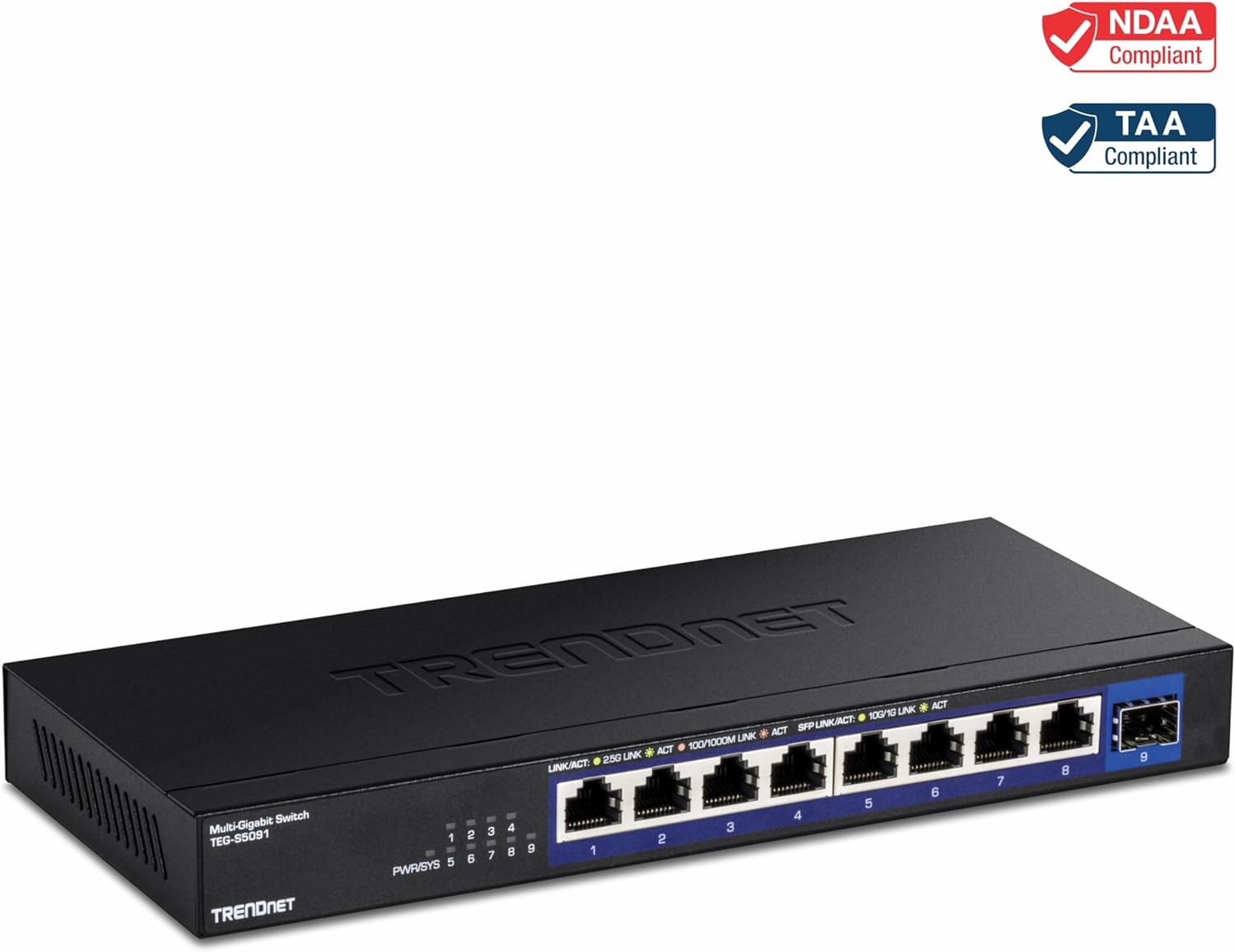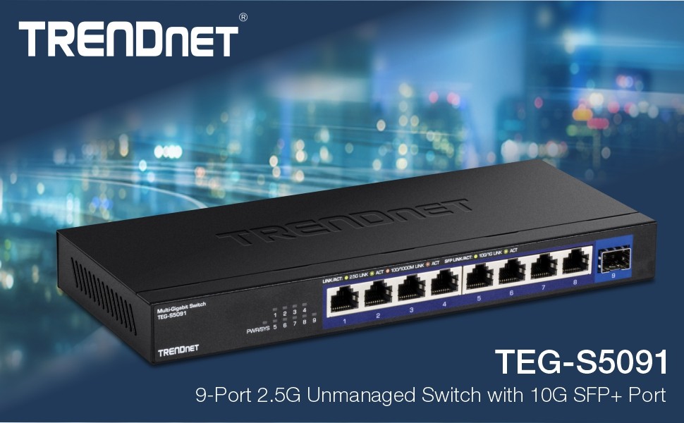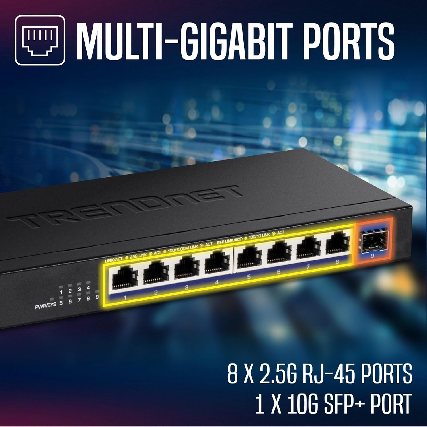 Expand your network’s bandwidth and reduce digital bottlenecks with TRENDnet’s 9-Port 2.5G Unmanaged Switch with 10G SFP+ Port. This 2.5G switch with an SFP+ port comes equipped with 2.5GBASE-T RJ-45 ports that provide speeds capable of up to 2.5Gbps over your existing Cat5e or better cabling, and a 10G SFP+ slot for ultra-fast, long-distance fiber networking. Each 2.5G switch with an SFP+ port features a durable metal enclosure and can be mounted to the wall for setup flexibility. The fanless design lowers energy consumption and eliminates operating noise. TRENDnet’s reliable 2.5G Ethernet switches with a 10G SFP+ port are cost-effective solutions to increase your network’s throughput.