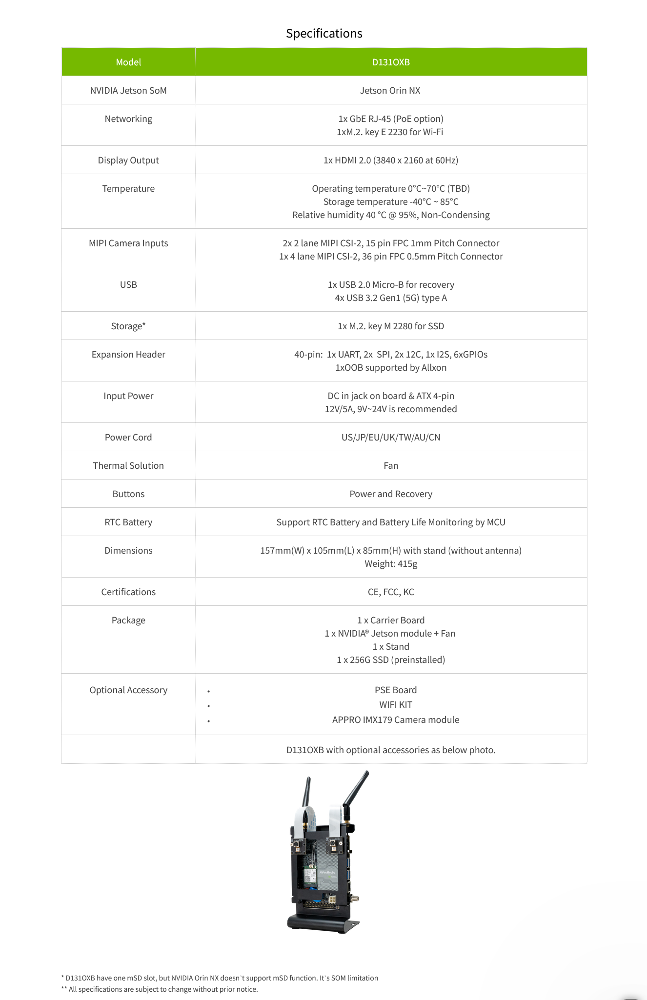 D131 is a ready-to-use product that integrates cameras, SSD, and thermal solutions to deliver an optimized user experience via its vertical mechanical design. The power input and expanded 40-pin are both designed at the bottom side to avoid cable interference. In addition, the capability of multi-camera support and its compact size design are also notable.