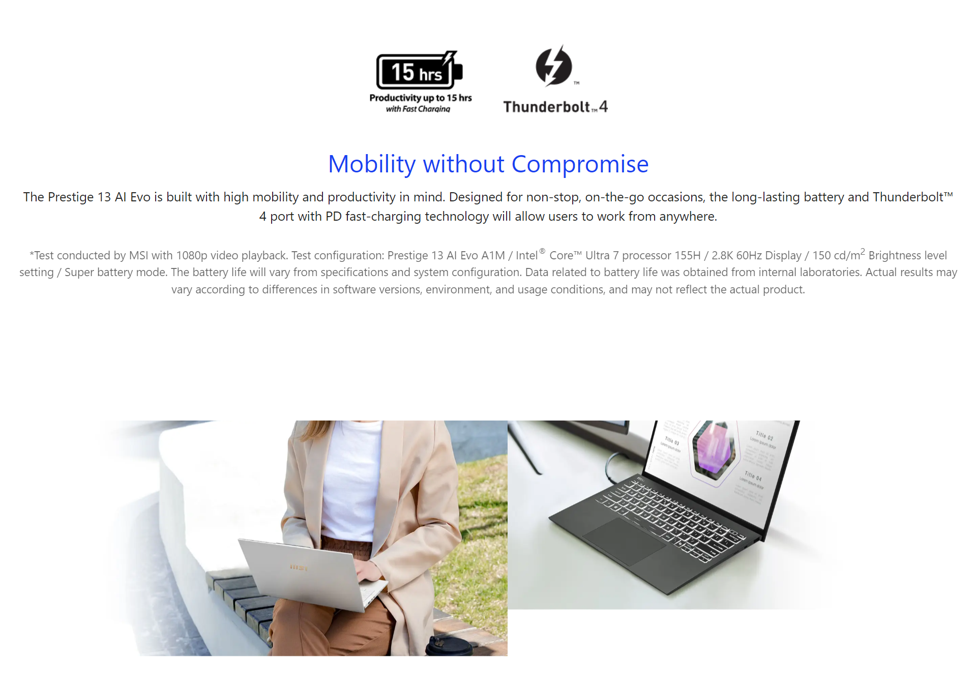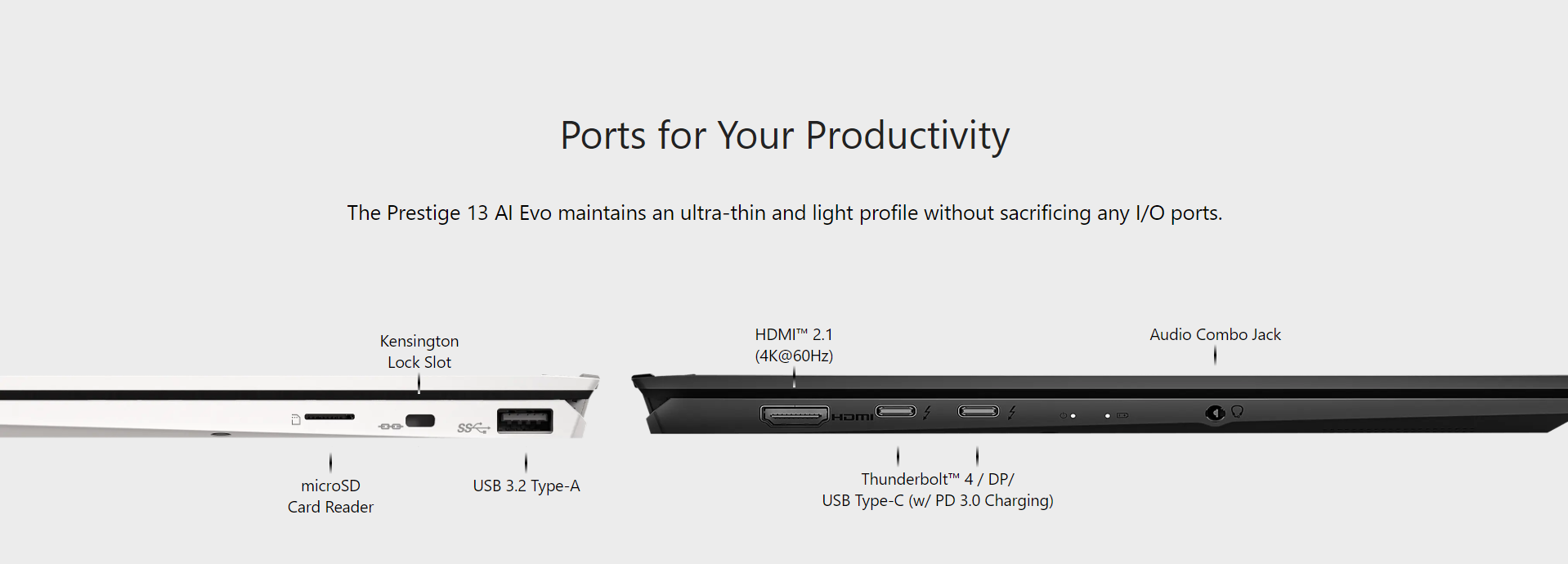 Reimagine productivity with AI. The ultra-thin and ultra-light Prestige 13 AI Evo provides maximum work-life performance balance that moves with you. Intel ® Evo™ Edition certified, the Prestige 13 AI Evo demonstrates extraordinary portability and performance, and faster Wi-Fi 7 wireless connection for any task to boost your productivity level up in AI Era.