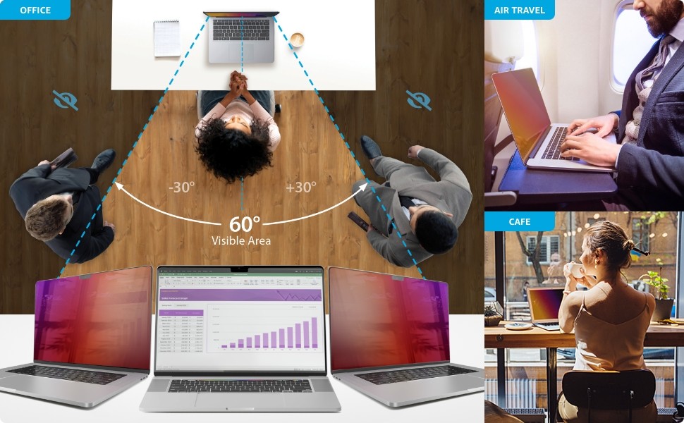 Use a privacy filter on your MacBook screen to protect sensitive and confidential data from being seen or captured by unwanted viewers. Our privacy screens feature Microlouver technology which obscures the view outside a 60-degree viewing angle. The gold finish instantly transitions from a clear view to a mirror effect outside of the intended viewing angle, significantly improving your visual privacy in public spaces or when traveling.