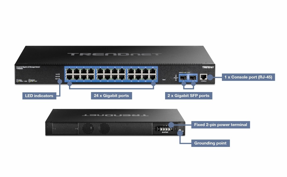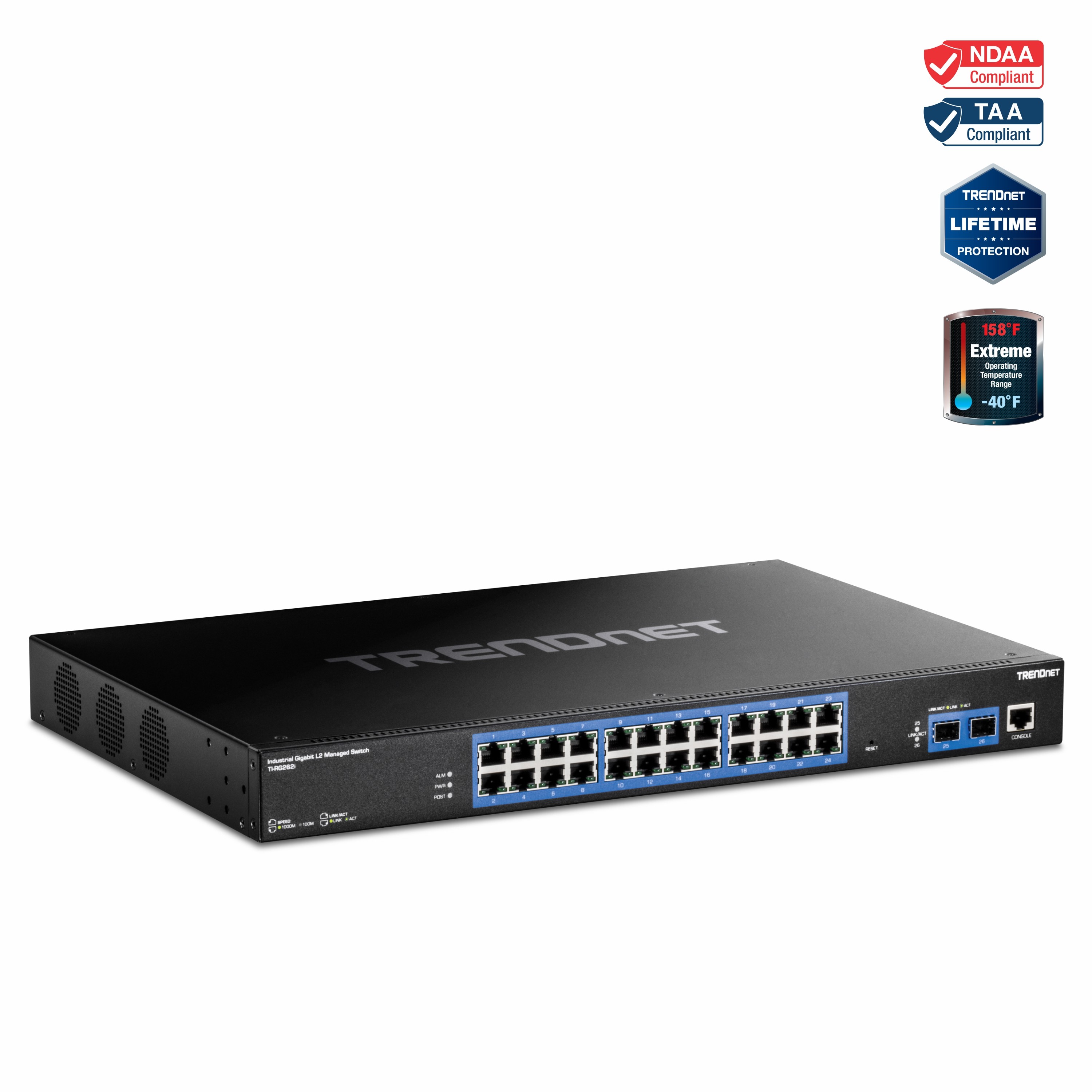 TRENDnet’s Industrial Gigabit L2 Managed Rackmount Switch offers advanced layer 2 managed features with enhanced traffic controls to meet the evolving demands of today’s SMB networks. Each industrial layer 2 rackmount switch is equipped with an IP30 rated metal enclosure, designed to withstand a high degree of vibration and shock, while operating within a wide temperature range of -40° – 70° C (-40° – 158° F) for industrial environments. Our industrial layer 2 rackmount switch models feature copper gigabit ports for high-speed device connections, as well as SFP ports that support 100/1000Base-FX SFP modules for long distance fiber networking applications. This industrial layer 2 rackmount switch feature a fanless design that eliminates operating noise and lowers energy consumption. This Industrial Gigabit L2 Managed Rackmount Switch provides an intuitive web-based management interface. Each TRENDnet industrial layer 2 rackmount switch supports advanced traffic management controls, troubleshooting, and SNMP monitoring. Advanced managed switch features include LACP to group ports together and increase bandwidth between switches, VLANs for segmenting and isolating virtual LAN groups, QoS to prioritize traffic, port bandwidth controls, and SNMP monitoring.