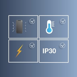 Rated for shock (EN 60068-2-27), freefall (EN 60068-2-32), and vibration (EN 60068-2-6)