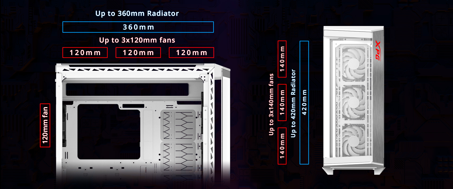 Enjoy the exceptional cooling features of BATTLECRUISER II, which boasts a high-airflow layout, four 120mm ARGB fans, and support for up to a 420mm radiator at the front of the chassis.