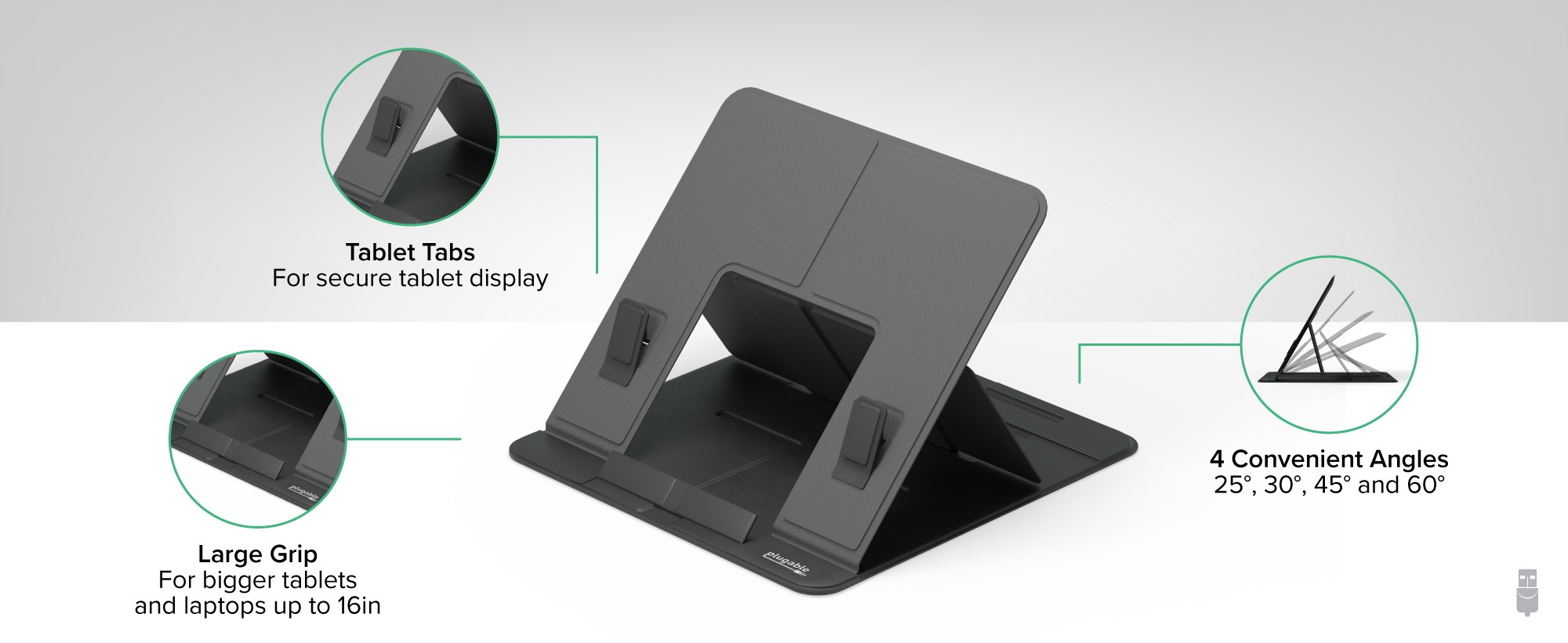 Meet the Plugable Portable Adjustable Laptop Stand and Tablet Stand (PT-STANDX), your go-to stand for a modern, mobile lifestyle. Designed to support devices up to 16” and 11lbs (5kg) – including the 16" MacBook Pro – this ergonomic laptop riser it's the perfect fit for a variety of laptops and tablets. Lightweight, ultra-thin, and foldable, this stand is a traveler's dream, easily fitting into your bag, and just right for airplane tray tables. Also makes a great iPad stand for drawing.