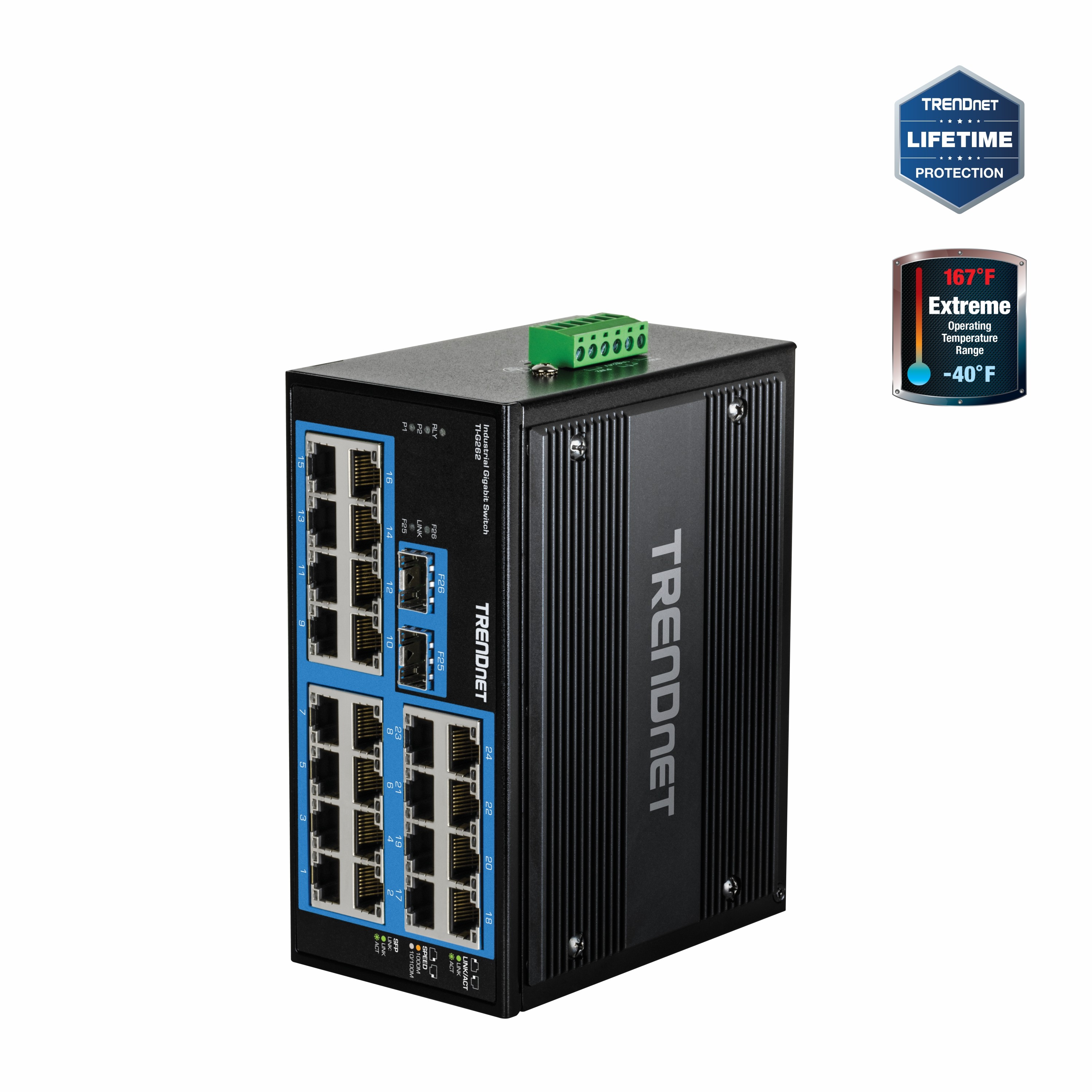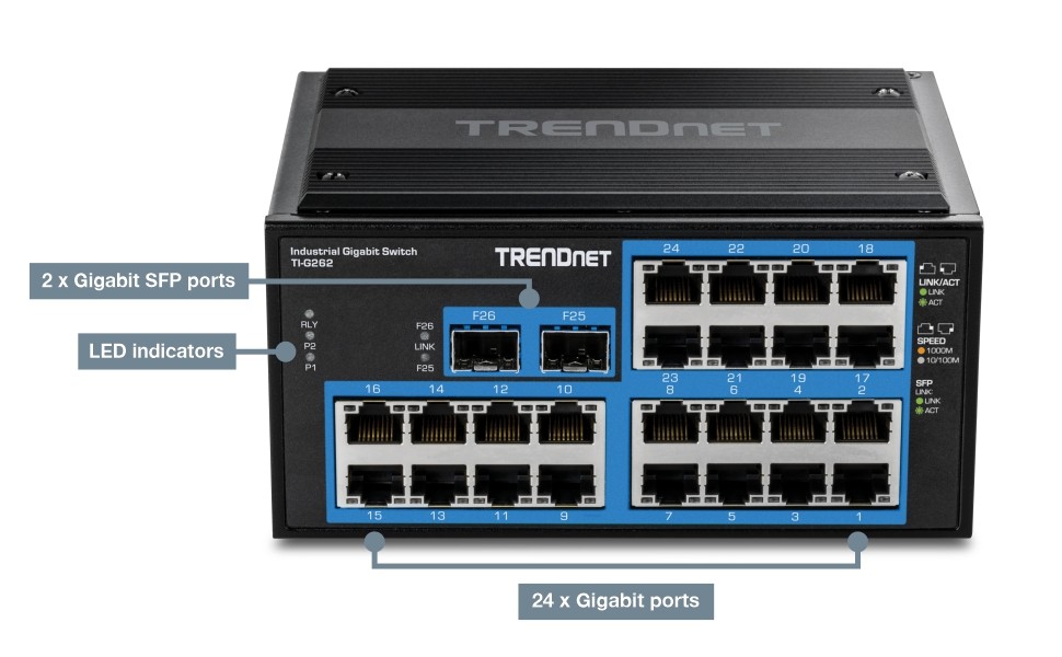 • TRENDnet LIFETIME PROTECTION: The TI-G262 Industrial 26-Port Gigabit DIN-Rail Switch is backed by TRENDnet’s Lifetime Manufacturer Protection.