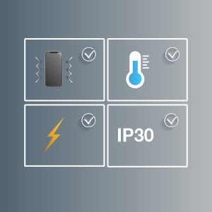 Rated for shock (EN 60068-2-27), freefall (EN 60068-2-32), and vibration (EN 60068-2-6)