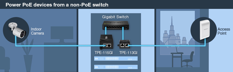 TRENDnet's Gigabit PoE Injector, model TPE-113GI, combines electrical power with a Gigabit network connection. Auto-sensing technology conveniently delivers the correct wattage needed to power your PoE devices. Connect the injector to a non-PoE Gigabit switch and then run an Ethernet cable with data + power to network a PoE device up to 100 meters (328 ft.) away.