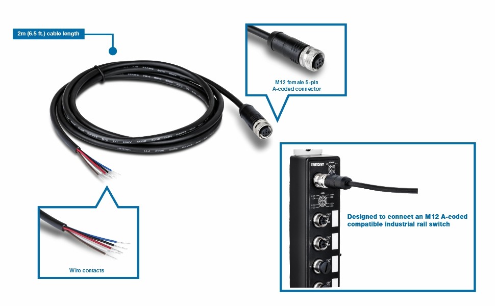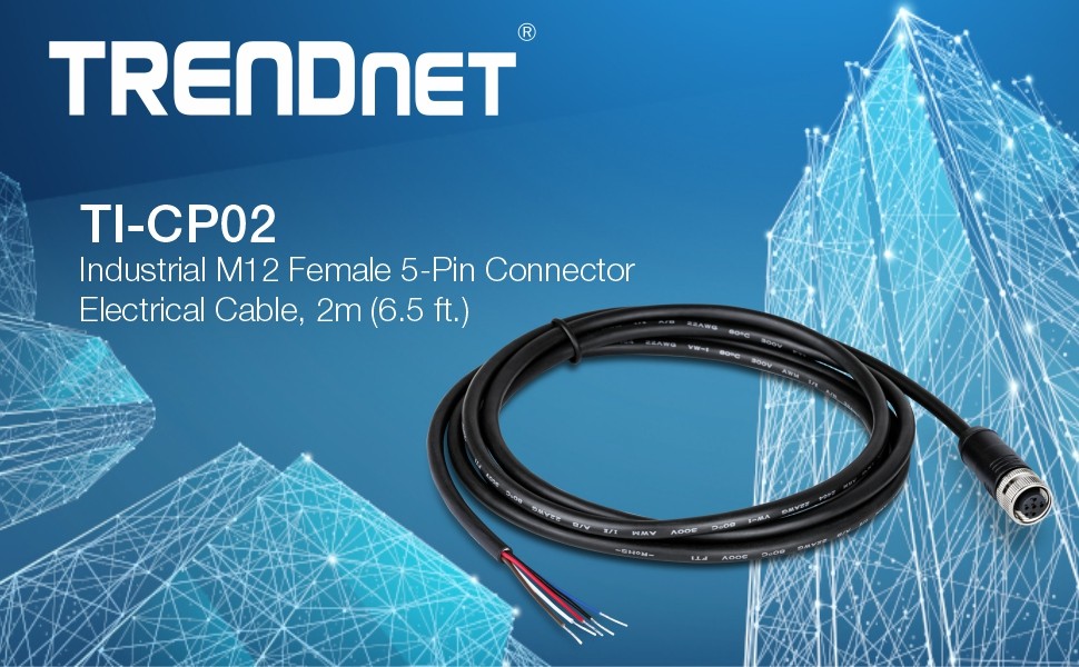TRENDnet’s Industrial M12 Female 5-Pin Connector Electrical Cable, model TI-CP02, is designed to connect an M12 A-coded compatible industrial rail switch. The M12 connector is specifically designed for moving bus, train, and other rolling stock applications.