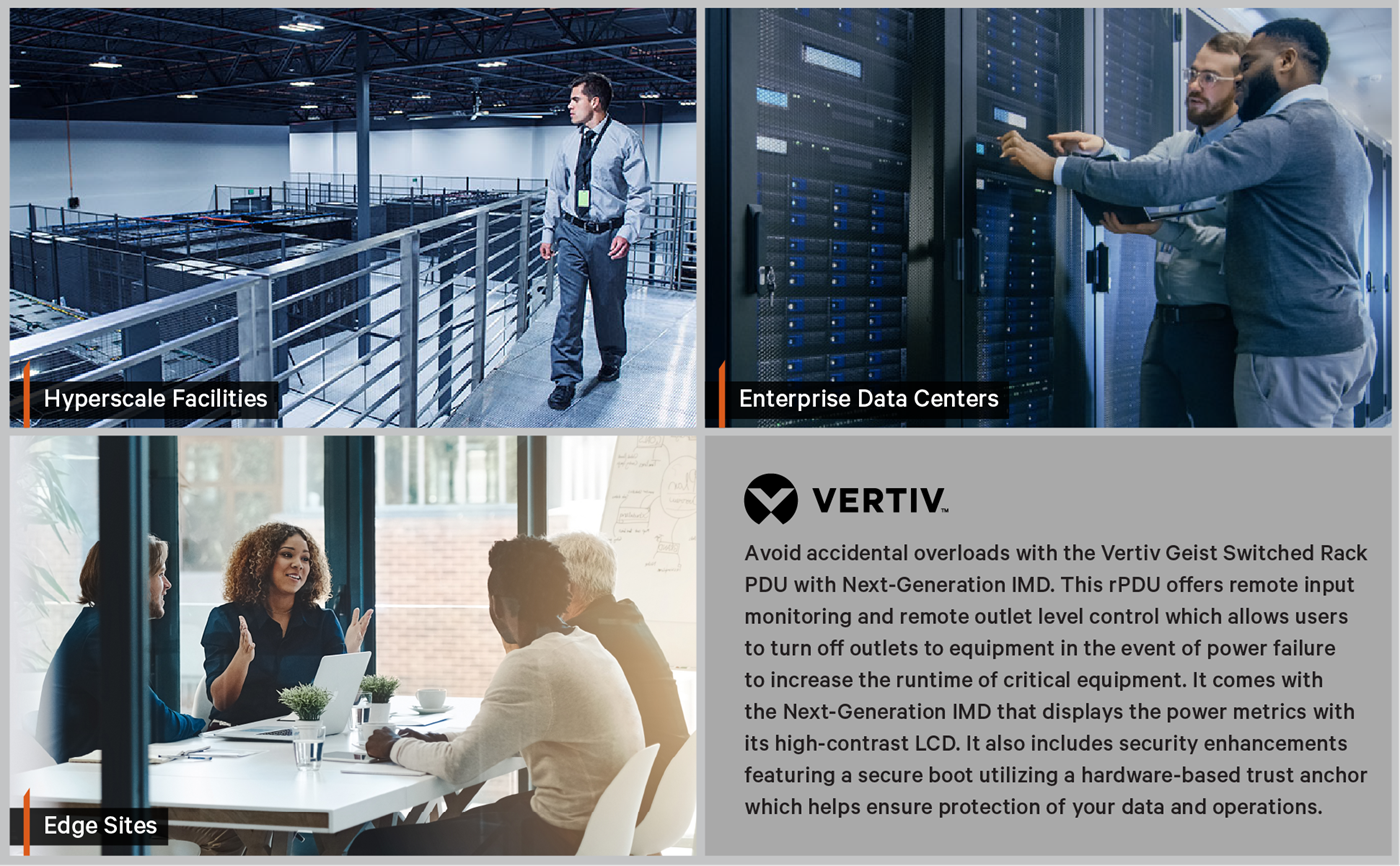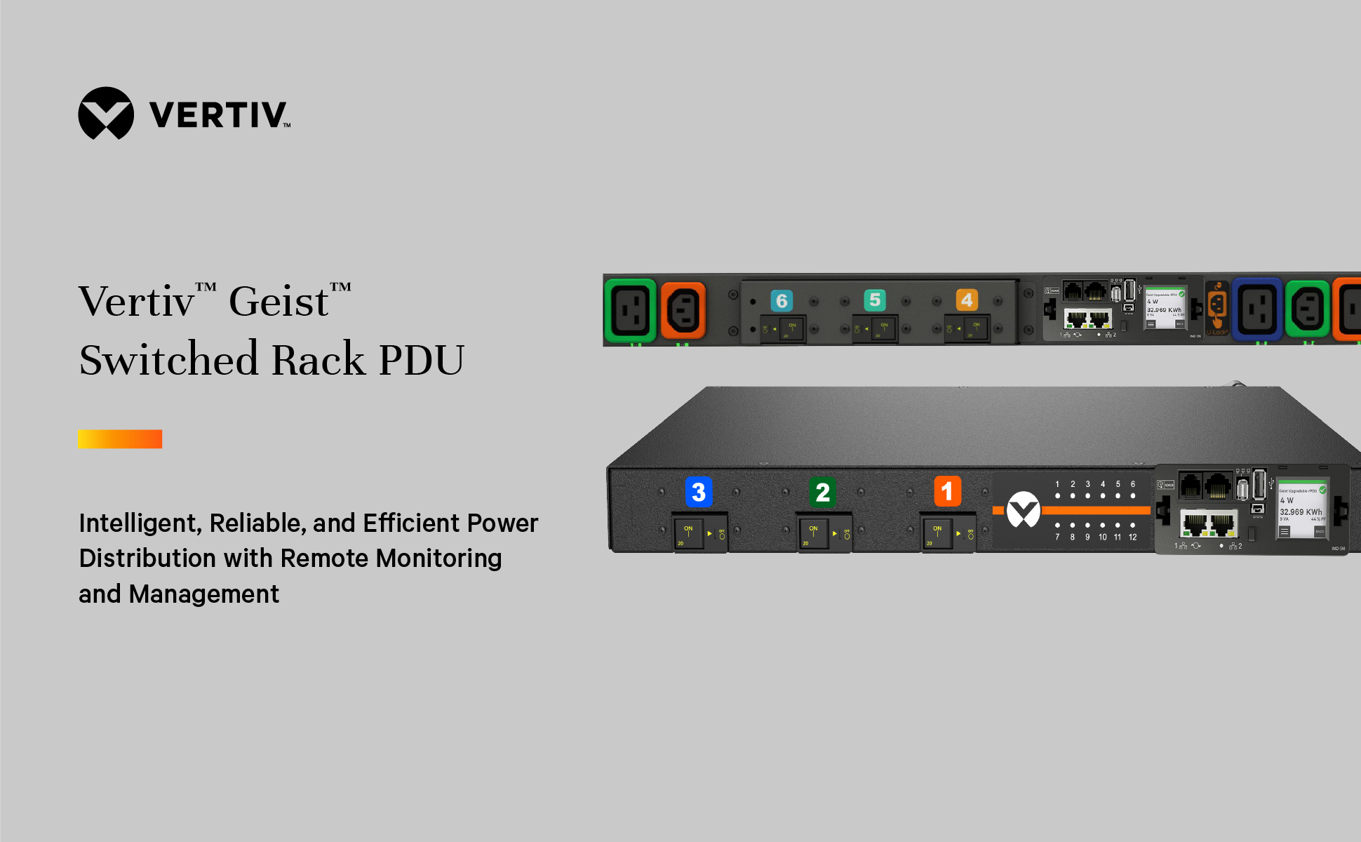 The Vertiv Geist Switched Rack PDU offers remote input power monitoring, as well as remote outlet level control allowing users to remotely turn off receptacles to avoid accidental overloads and power cycle equipment to reboot unresponsive critical IT equipment.