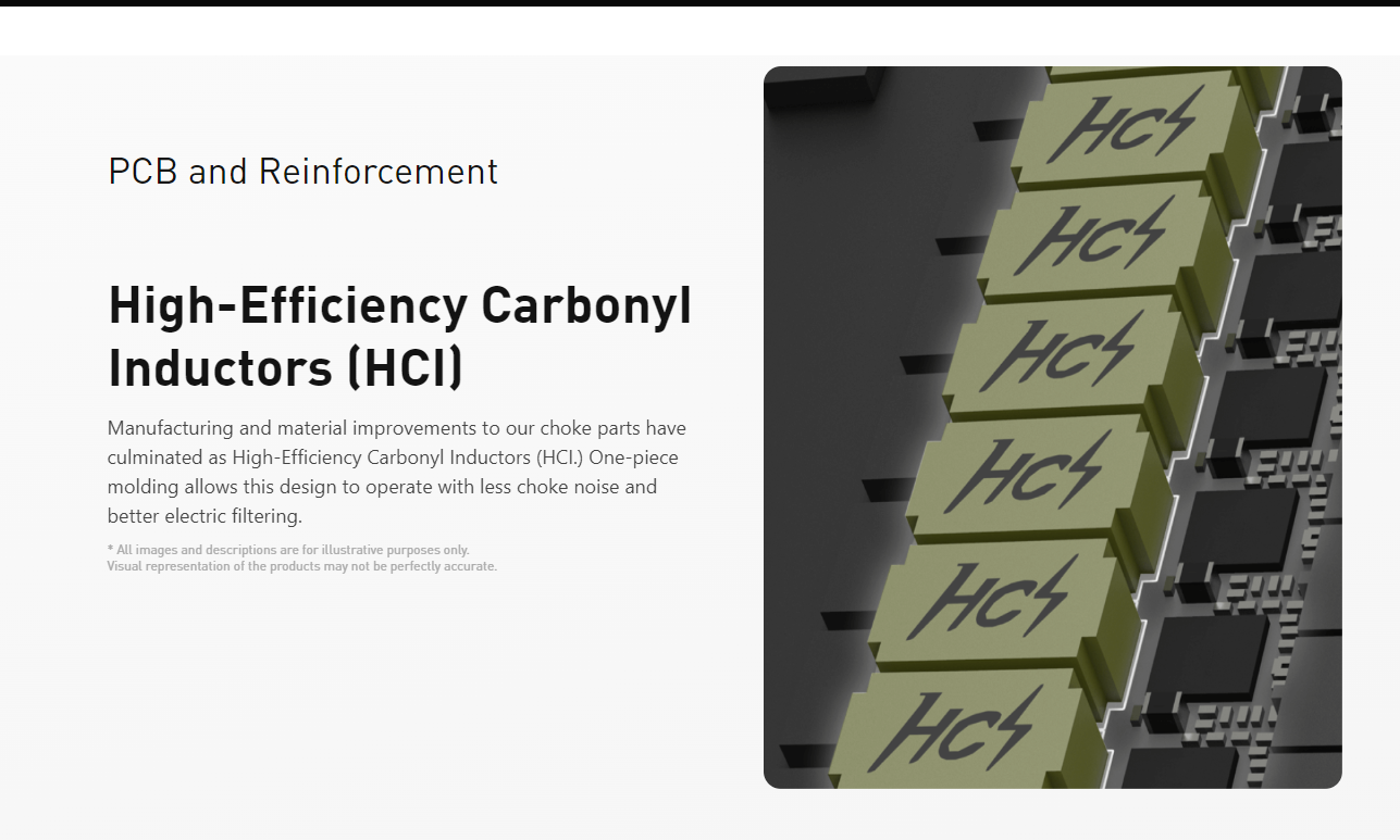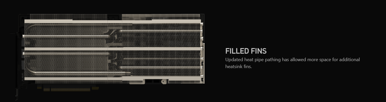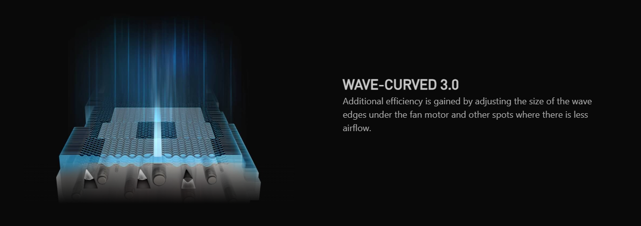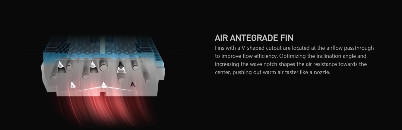 Sections of different heatsink fins disrupt unwanted airflow harmonics and reduce noise.