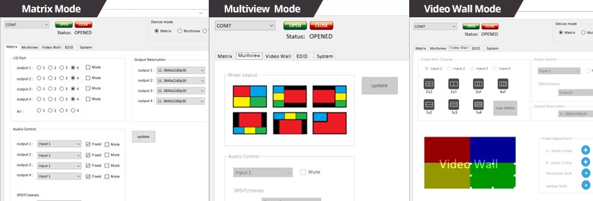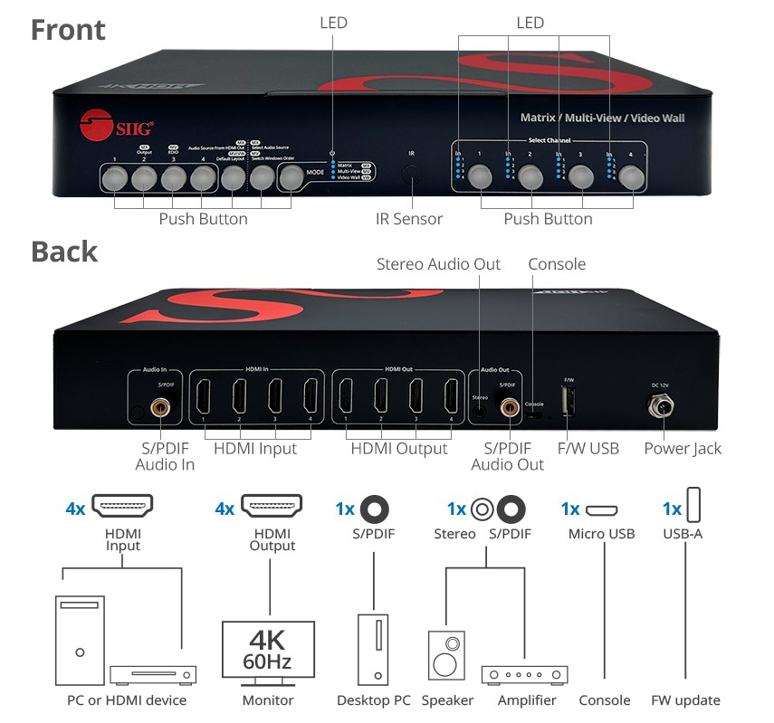 Comes with four HDMI video input ports, four HDMI output ports, one S/PDIF audio in jack, one S/PDIF audio out jacks, one 3.5mm audio out jacks, one Micro USB for software control port, one USB-A for FW update port, four push buttons for reserved, three function buttons, four push buttons for video input selection or Select windows 1-4 source, one DC power jack (12V/3.33A)