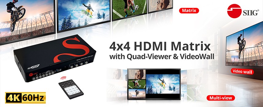 4x4 HDMI Matrix + Video Wall + Quad-Viewer Processor, 4K@60Hz, HDCP 2.2, Seamless Switching, 1x2, 1x3, 1x4, 2x1, 2x2, 3x1 and 4x1 Video Wall Modes, PIP and Five Quad-view Display Modes, EDID Management, Push Buttons, IR Remote Control, Software Control, TAA Compliant