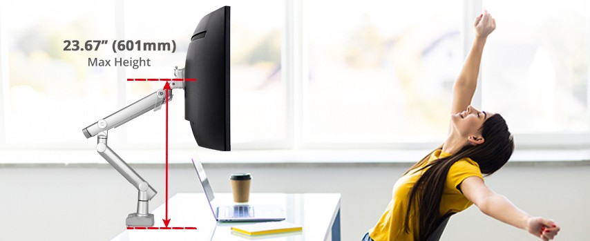 Lift the arm 23.67 inches (601.2 mm) to find the perfect and ergonomic viewing height that relieves your body strain, and creates your sit or stand ergo-working environment