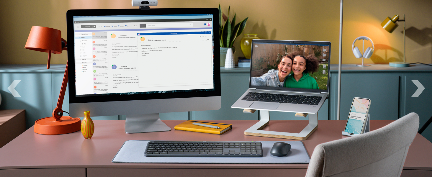One mouse and keyboard to move seamlessly between your home desktop and your work laptop*. Connect them via Bluetooth or Logi Bolt Receiver.