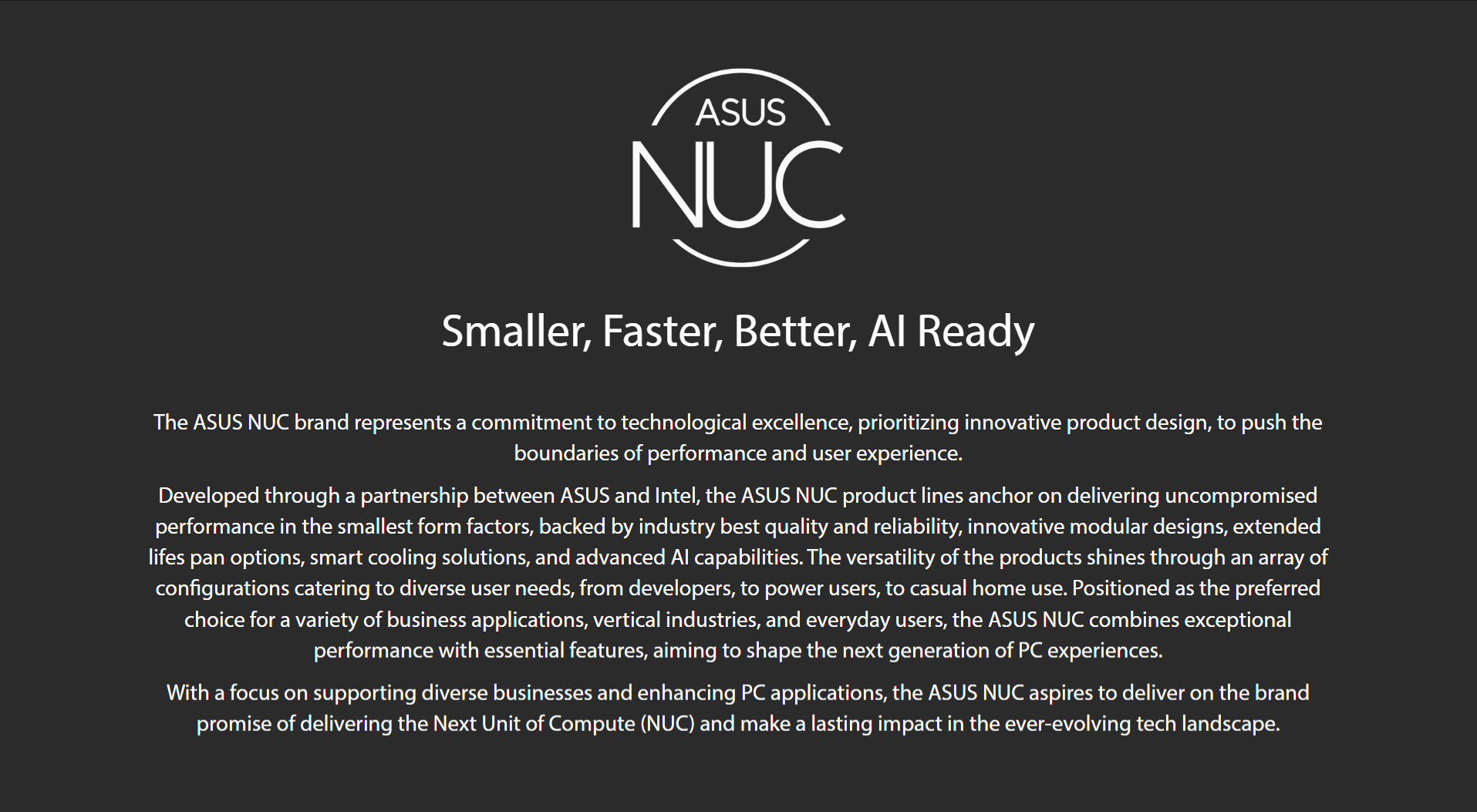 ASUS NUC 14 Pro is compact, powerful, and reliable, offering unparalleled performance, exceptional security and manageability, AI readiness, Wi-Fi sensing, wireless connectivity, and customization to drive modern business, edge computing, and IoT use cases.