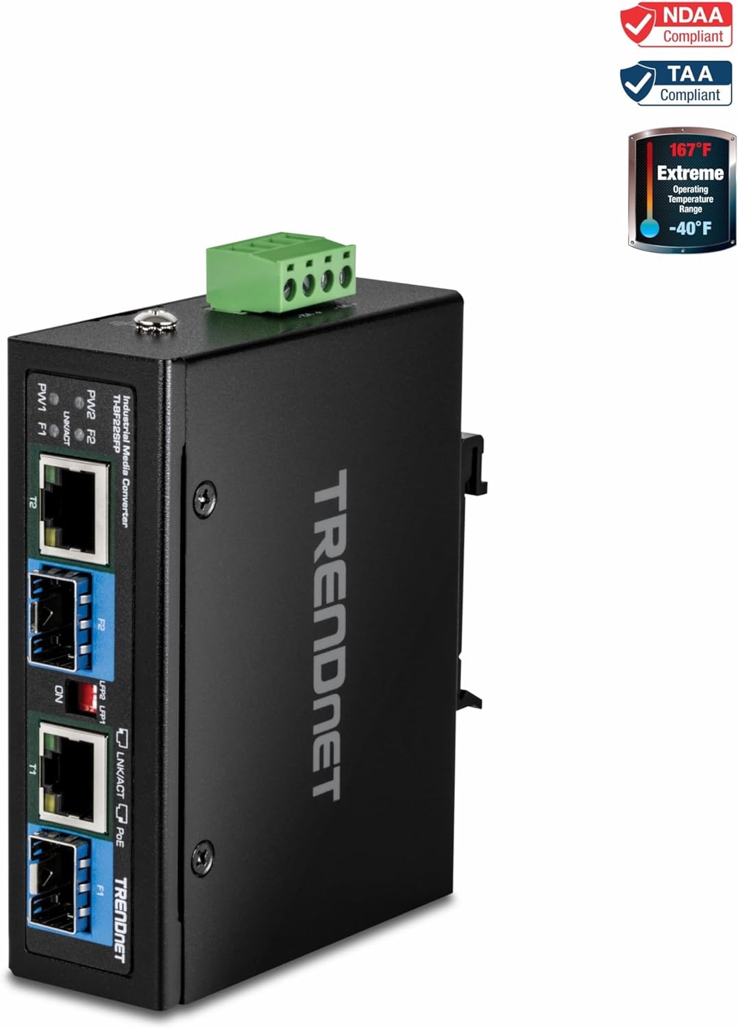 Hardened IP30 converter for industrial networking environments, with a -40°– 75° C (-40° – 167° F) operating temperature range.