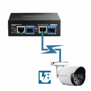 Converts long distance fiber to copper while providing power to PoE, PoE+, and PoE++ compliant devices, such as IP cameras and wireless APs.