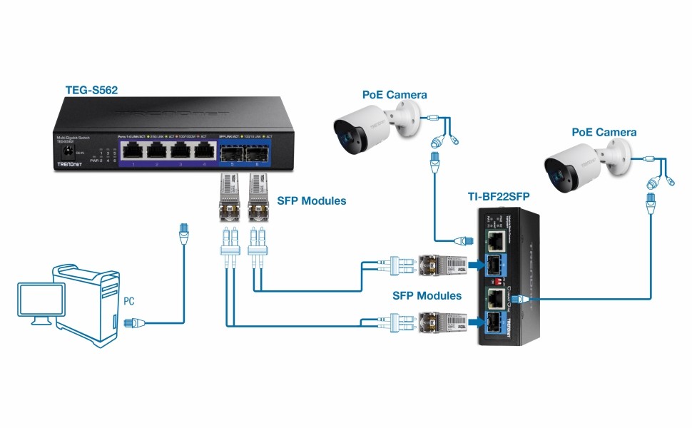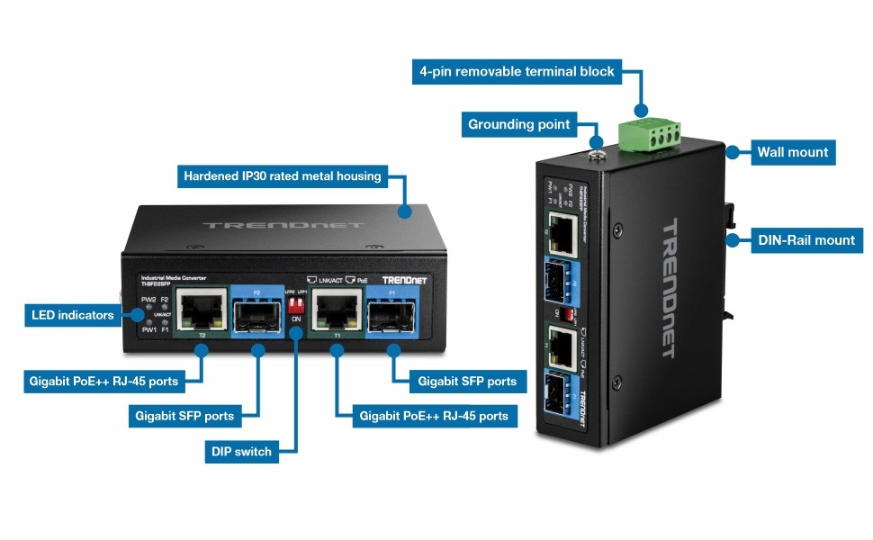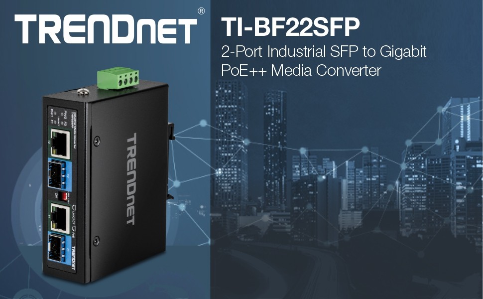 TRENDnet’s 2-Port Industrial SFP to Gigabit PoE++ Media Converter, model TI-BF22SFP, converts two long distance fiber connections to copper connections, while providing power to PoE, PoE+, and PoE++ compliant devices, such as IP cameras, VoIP phones, and wireless access points. With an operating temperature range of -40°– 75 °C (-40° – 167 °F), the industrial PoE++ fiber media converter features a hardened IP30 rated metal housing suitable for tough, industrial environments. The industrial PoE++ fiber media converter’s rugged design also provides protection from shock, freefall, and vibration.