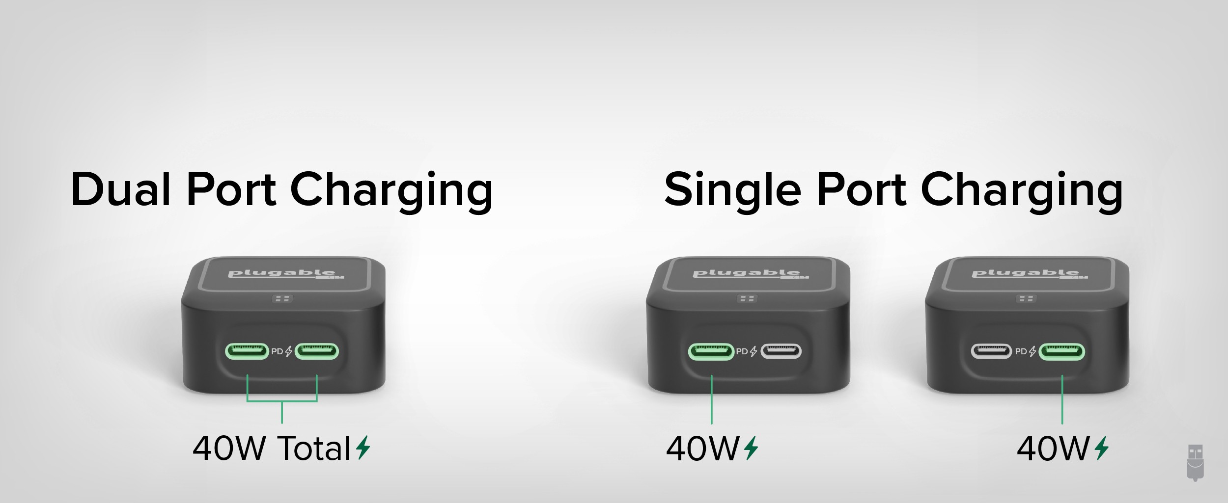 The PS-40C2W has a couple of unique features. First, unlike a traditional PD Charger that sticks out from the wall like a flagpole, this charger has a low-profile design, perfect for throwing in your bag or when you need to plug in behind a desk. Second, and this shouldn’t be overlooked, downward-facing ports to minimize wear and tear of your cords. The wall charger for USB C also features foldable prongs for travel and LED indicators to communicate charging status at a glance — glowing green for slow charging and blue for fast charging.