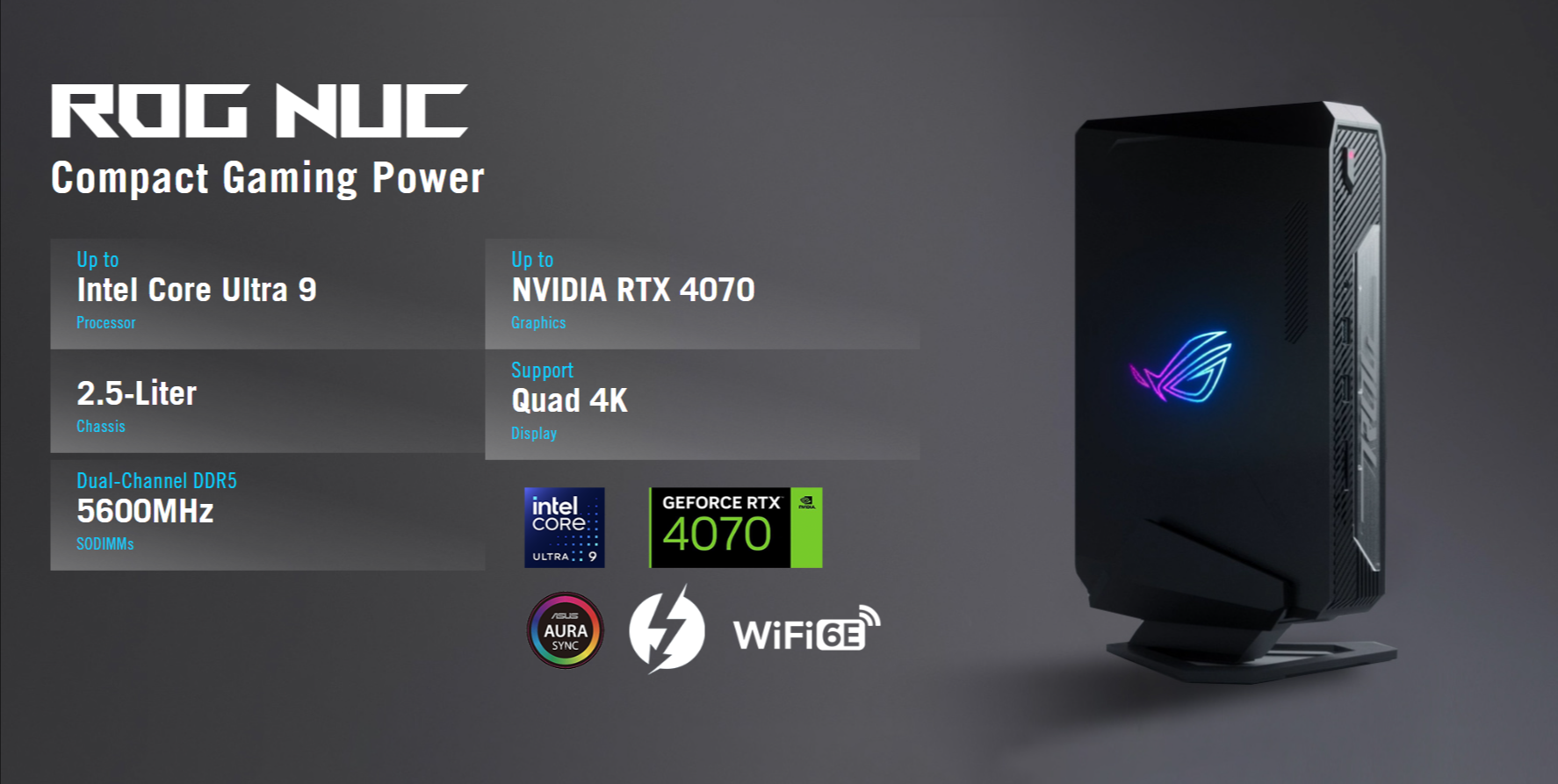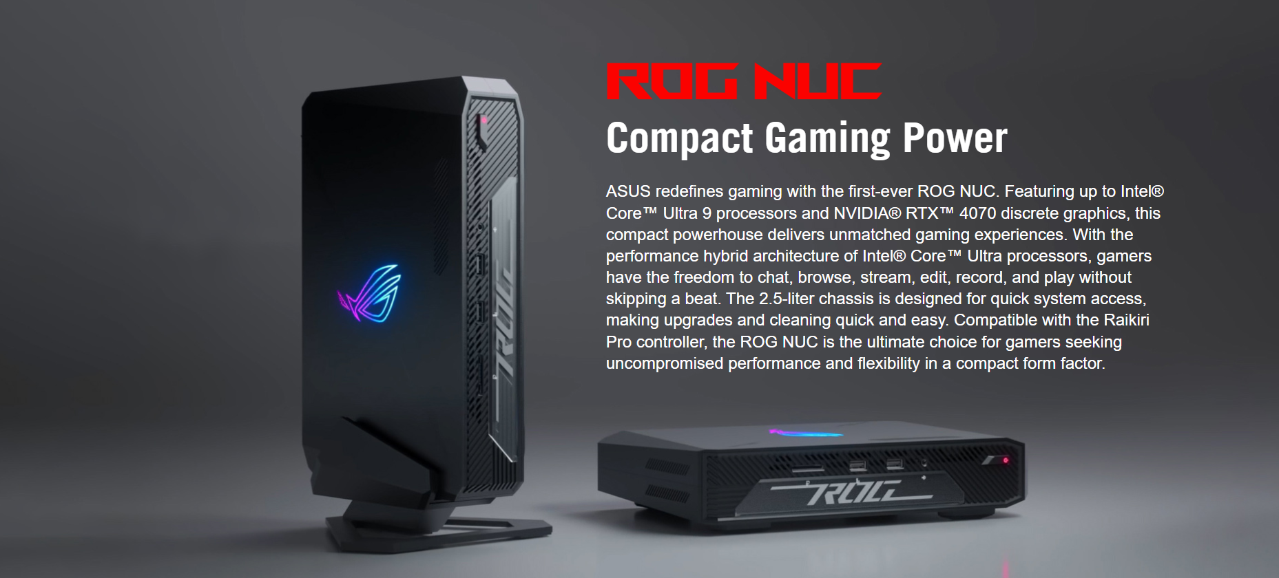 Ultra-small and ultra-powerful, ROG NUC Mini PCs built for the next generation of gaming, with an unparalleled combination of superior performance, riveting visuals, and fast and flexible connectivity.