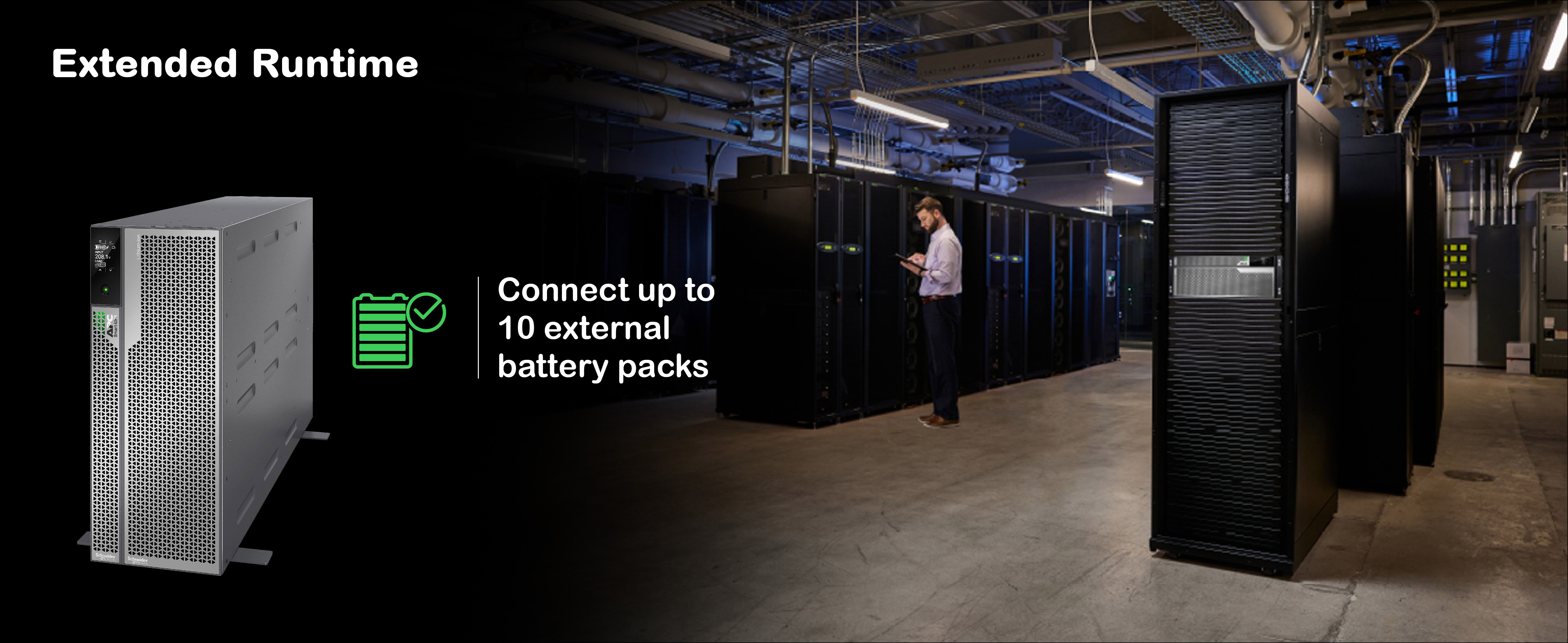 Connect up to 10 external battery packs for extended runtime needs