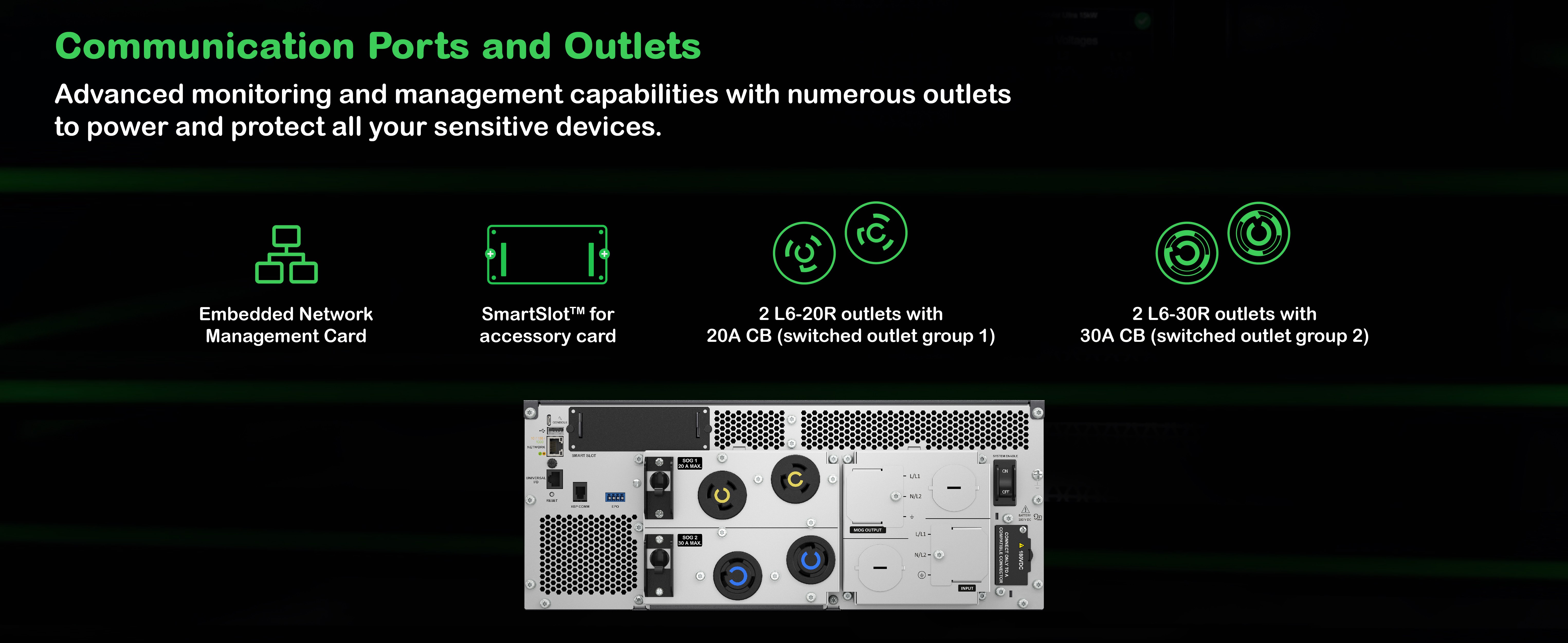 (2) L6-20R with 20A CB, (2) L6-30R with 30A CB Including 2 switched outlet groups