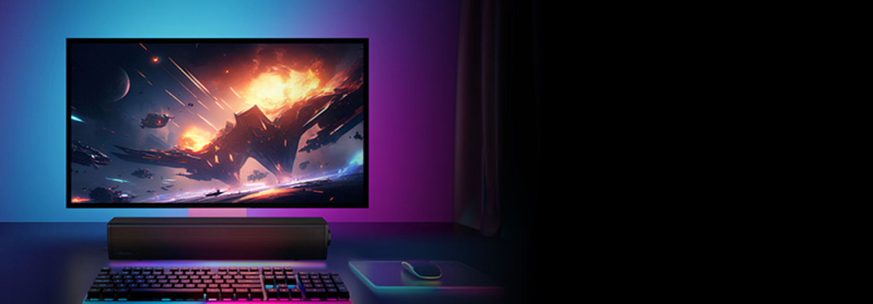 A single USB-C cable* is all you need to bring the Sound Blaster GS3 to life. Delivering both audio and power, reduce any cable clutter, with easy-to-reach buttons and volume control knob on the right side of the soundbar.