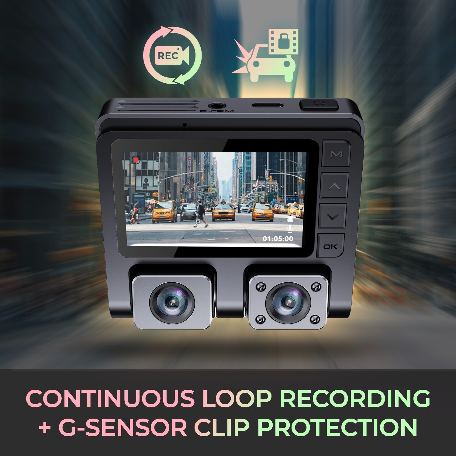 The Orbit D100 offers a unique 1080p dual-camera setup, capturing both the road ahead and the interior of your vehicle simultaneously. Despite its compact design, it is packed with features, supporting dual 1080p video recording, crystal-clear audio, photo capture, and more, ensuring every moment is documented with full HD clarity.