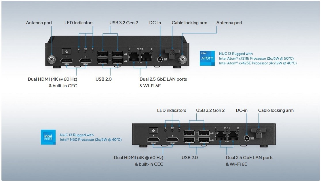 This innovative ASUS NUC 13 Rugged solution transcends the traditional notion of a PC. It stands as a resilient, potent, and robust edge computing platform capable of fueling a myriad of today’s critical and demanding use cases. Whether for work, home office, business, or industrial applications, the ASUS NUC 13 Rugged’s versatility opens up new opportunities and possibilities for partners throughout their value chain. ASUS NUC 13 Rugged features the Intel ® Atom ® x7425E / Intel ® Atom ® x7211E / Intel ® Processor N50, delivering robust performance. It is equipped with Intel ® UHD Graphics integrated with an IPU for enhanced graphics capabilities. The Intel ® Wi-Fi 6E AX210 comes pre-installed in the M.2 slot for most kit SKUs, complemented by external antennas on the chassis, ensuring reliable and high-speed wireless connectivity. Storage-wise, it boasts a 64 GB eMMC soldered-down and includes an M.2 2280 key M slot, providing support for PCIe x2 NVMe SSD for expanded storage options.