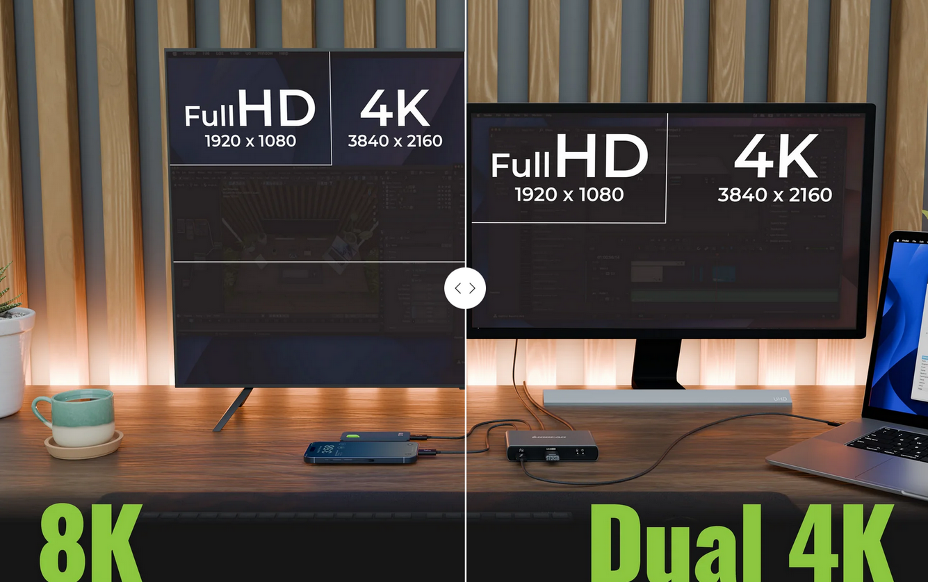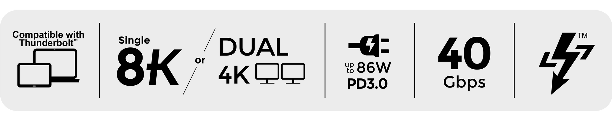 Drive a single, stunning 8K@30Hz display or immerse yourself in dual 4K@60Hz glory, all through the convenience of a single USB-C ® cable. Witness vibrant detail and buttery-smooth motion, taking full advantage of Thunderbolt 4 speeds.