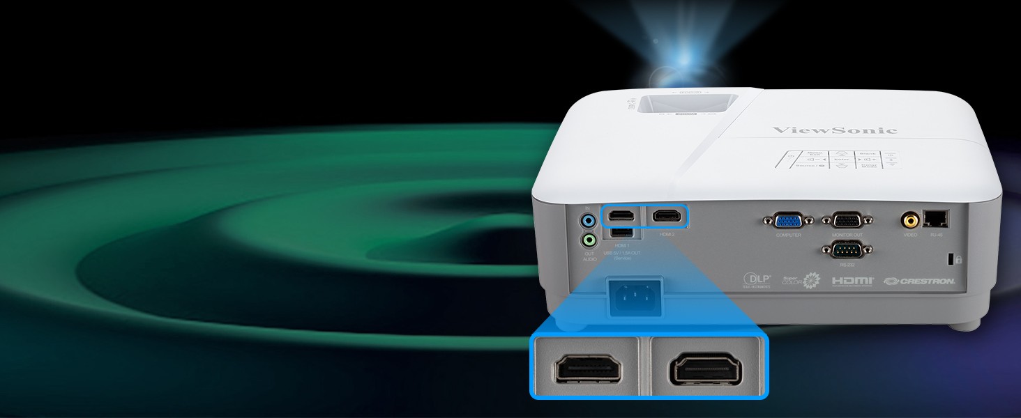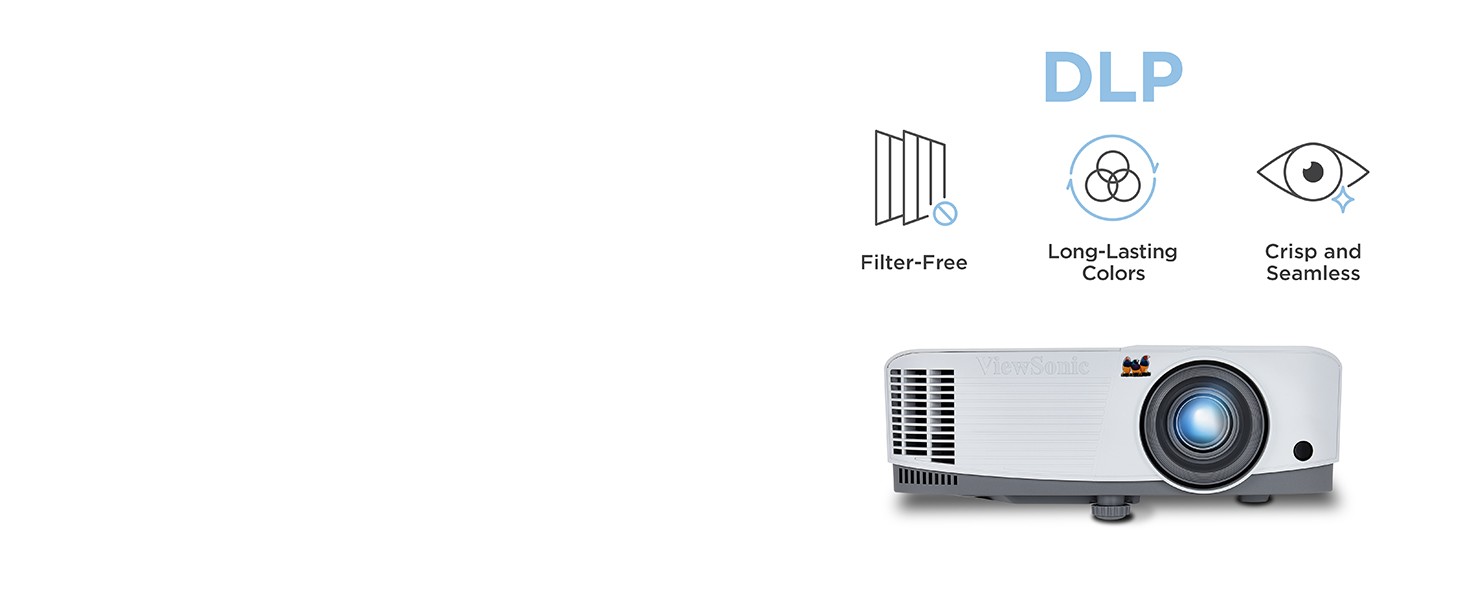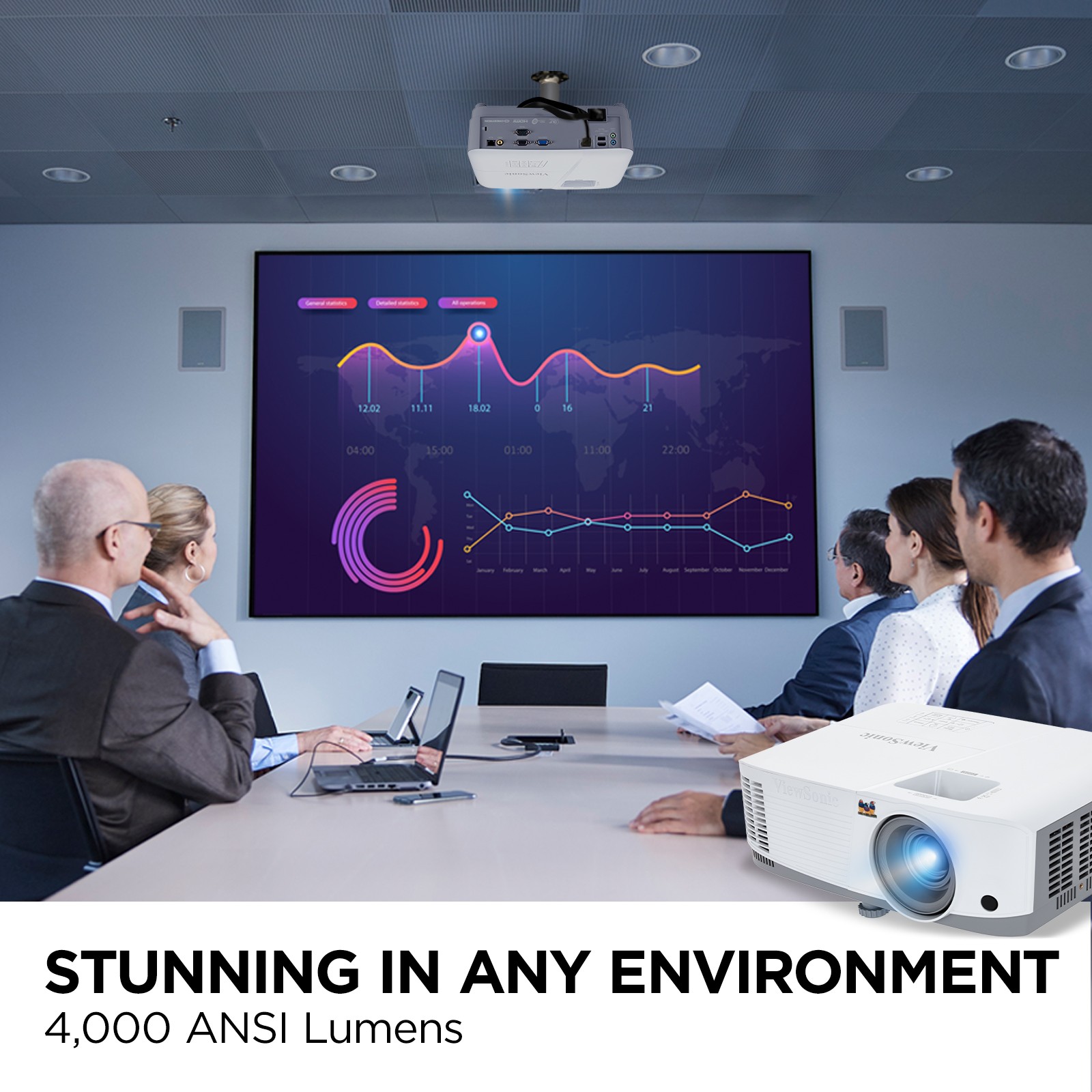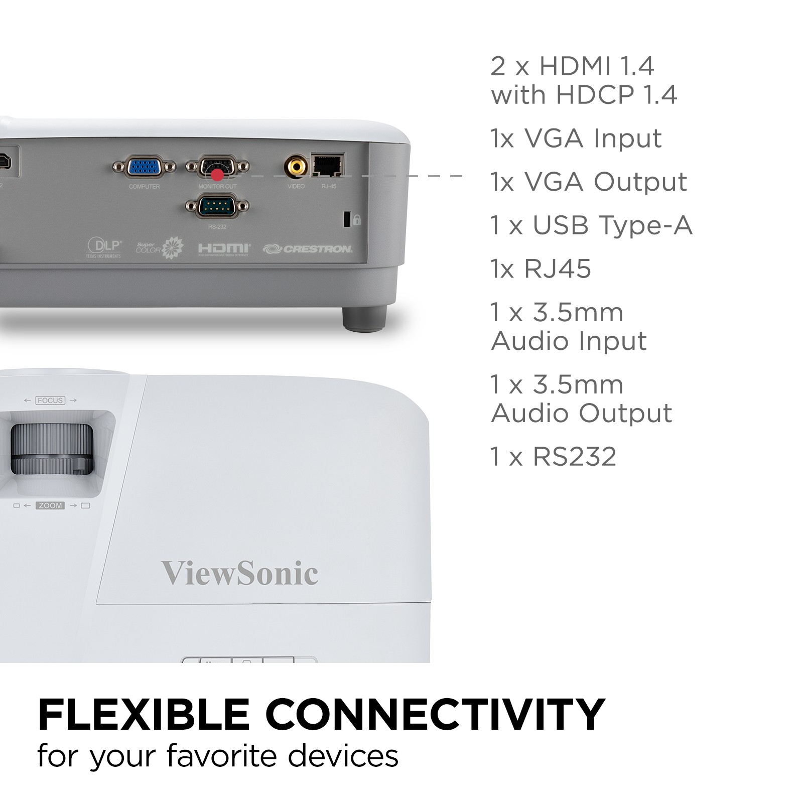 Upgrade your projector setup with the ViewSonic® PA504W high-brightness projector. Featuring a versatile 1.21 – 1.57 throw ratio, this projector can be easily installed onto most existing projector mounts. Plus, with 4,000 ANSI lumens of brightness, audiences can enjoy stunning clarity – even in environments with strong ambient lighting. A Texas instruments .65” DMD chip delivers a high native contrast ratio to make images clearer and more compelling. Each PA504W projector features a sealed optical engine that reduces maintenance as well as state-of-the-art DLP® technology that enables users to enjoy consistent colors and enhanced clarity over an extended period. Connect your projector to Crestron, AMX, PJ Link, ATEN, Extron or other LAN control systems for streamlined device management. Dual HDMI ports enable users to easily switch between content sources. Add an optional ViewSonic WPD-700 Wireless Screen Casting Kit to the projector’s USB-A port to make casting content both faster and cable-free.