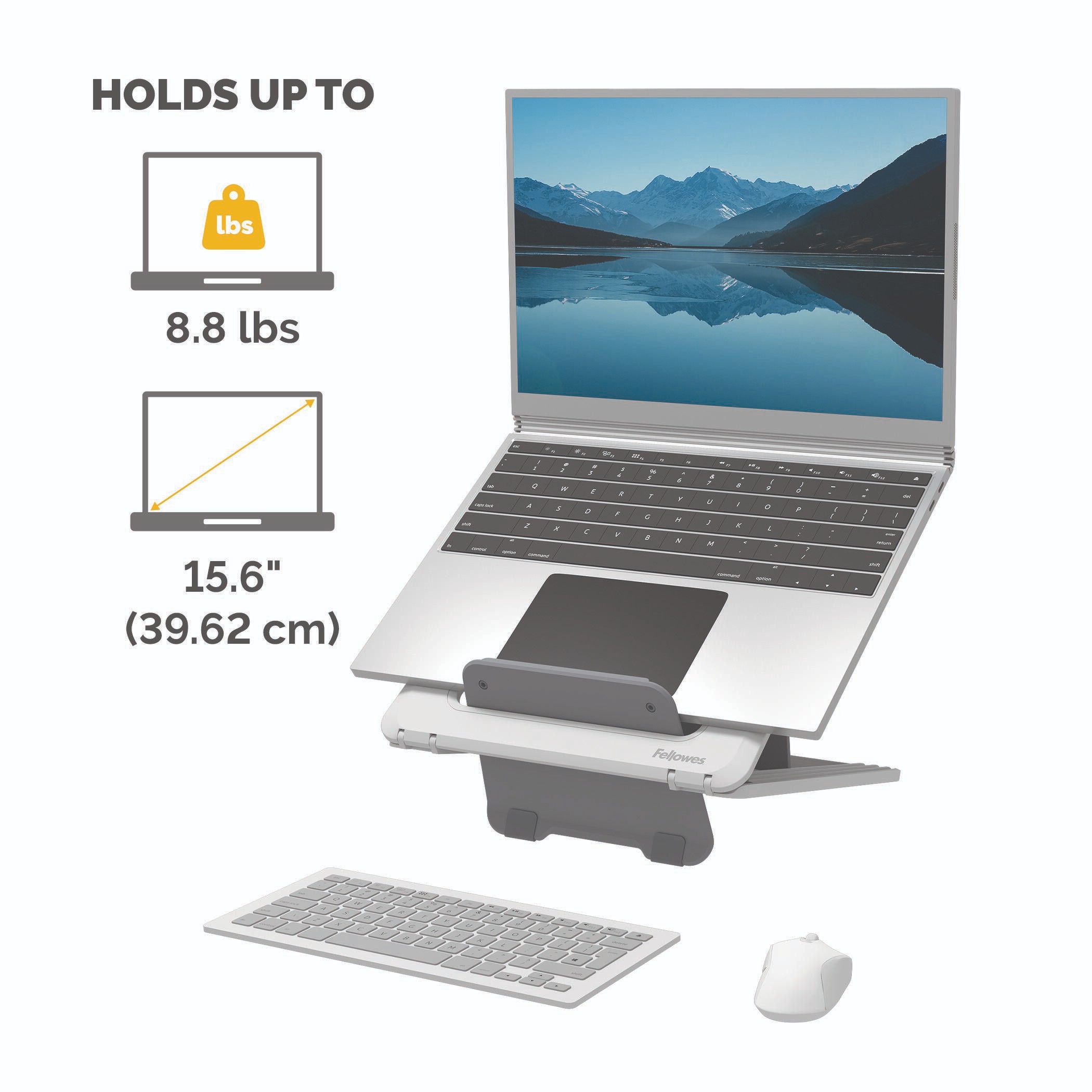 Engineered to accommodate laptops up to 15.6 inches and weighing up to 8.8 lbs, providing robust support and stability. With a sleek design and durable construction, this stand ensures secure positioning for your device, allowing you to work with confidence and focus.