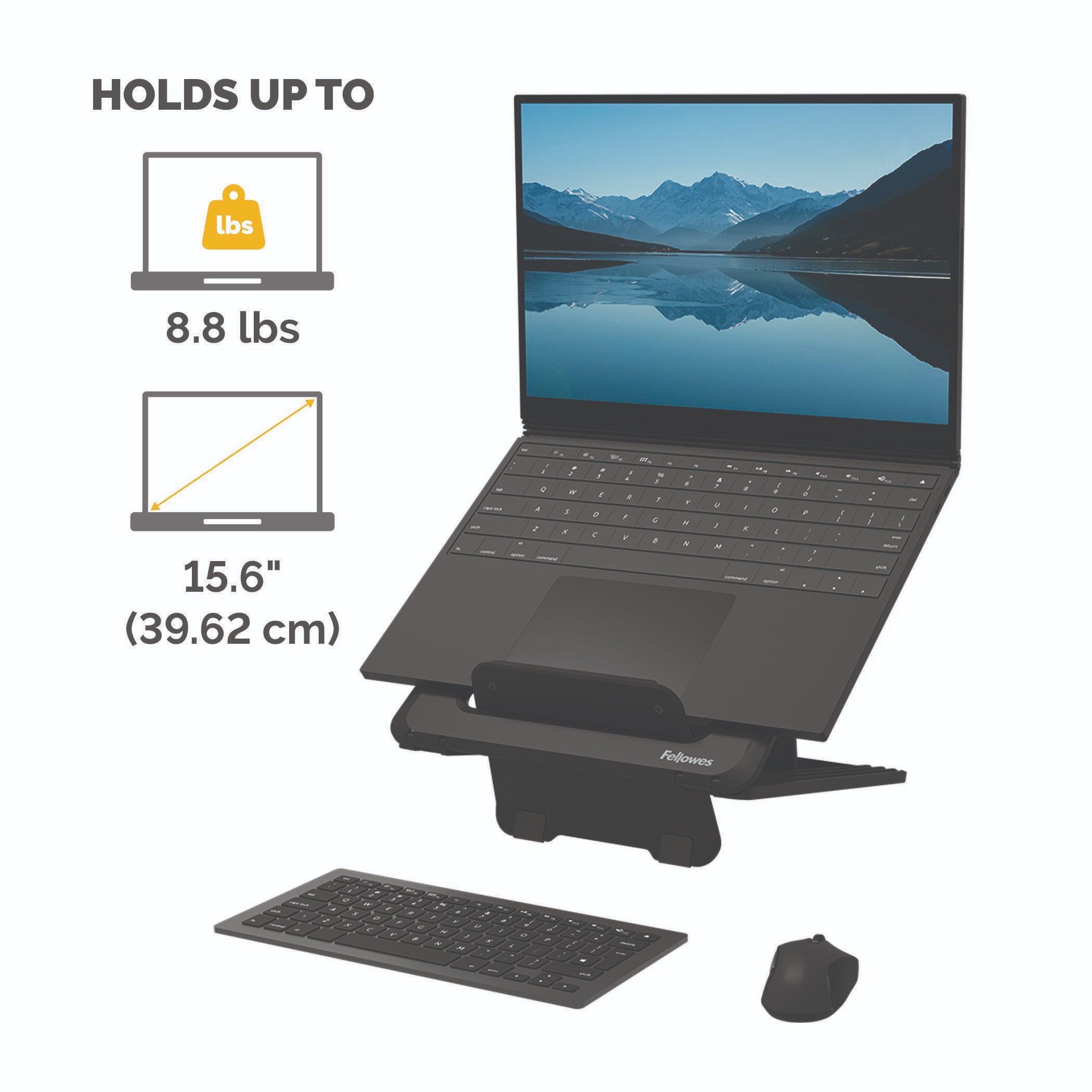 Engineered to accommodate laptops up to 15.6 inches and weighing up to 8.8 lbs, providing robust support and stability. With a sleek design and durable construction, this stand ensures secure positioning for your device, allowing you to work with confidence and focus.