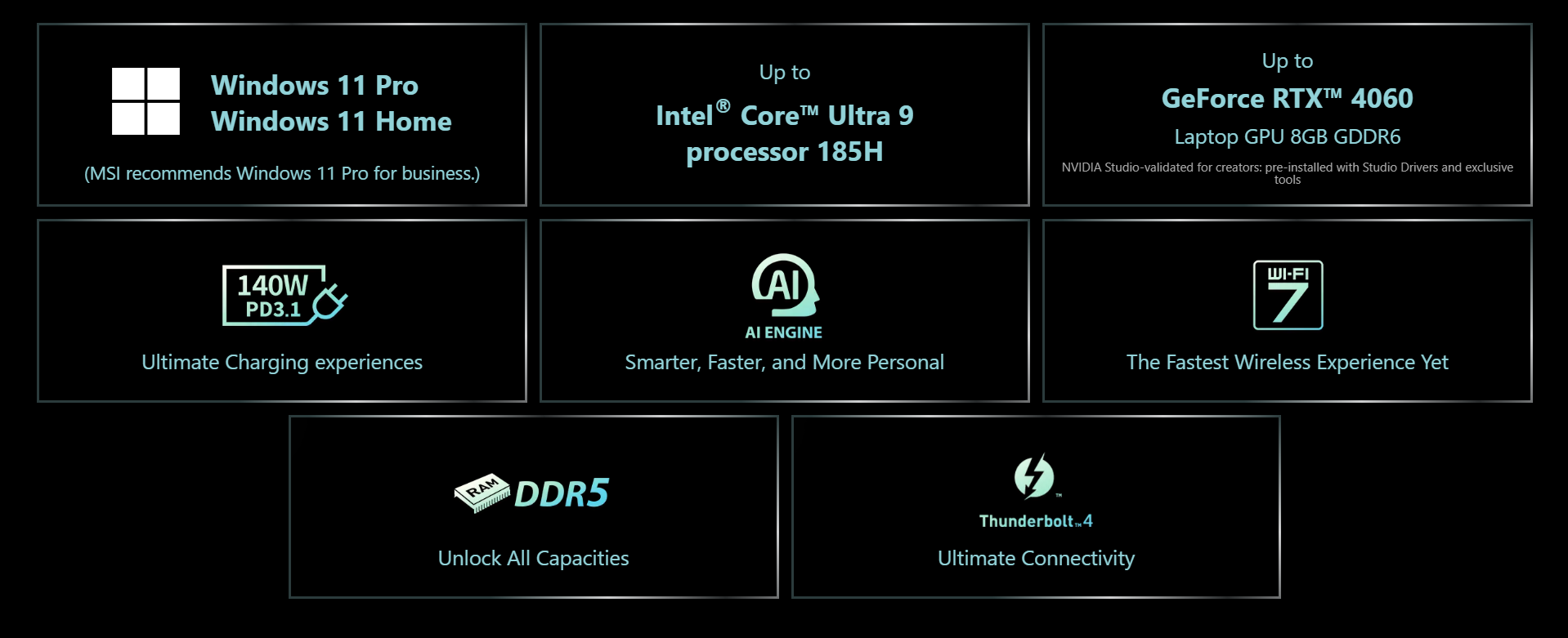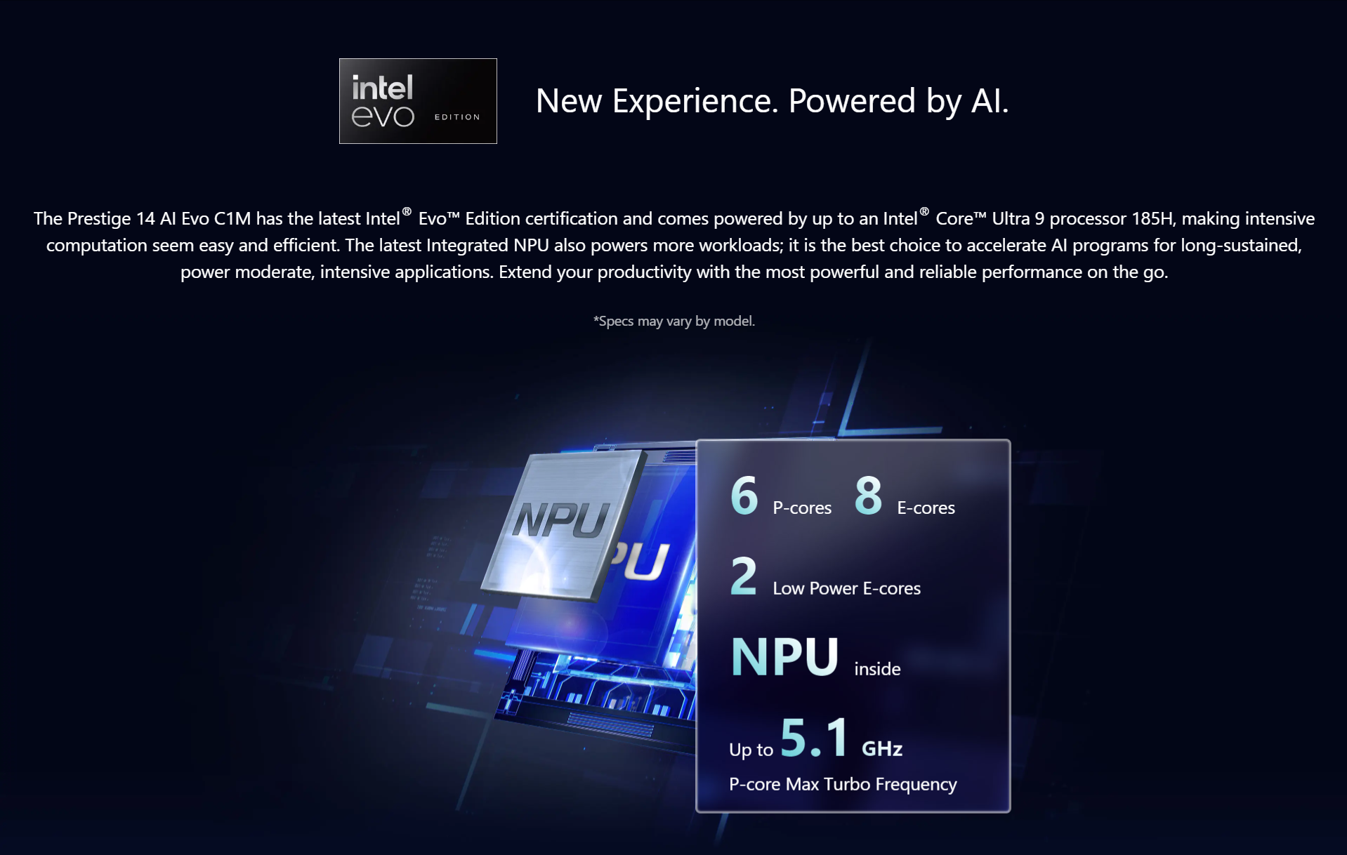 Experience powerful AI with the new Prestige 14 AI Studio C1V. Its extreme performance and high portability is designed to be your best portable partner. With the latest Intel ® Evo™ Edition powered by up to Intel ® Core™ Ultra 9 processor 185H, exclusive MSI AI Engine, vast DDR5 memory and Wi-Fi 7 wireless to boost your productivity to maximum, you'll be ready for productivity in or out of the office.