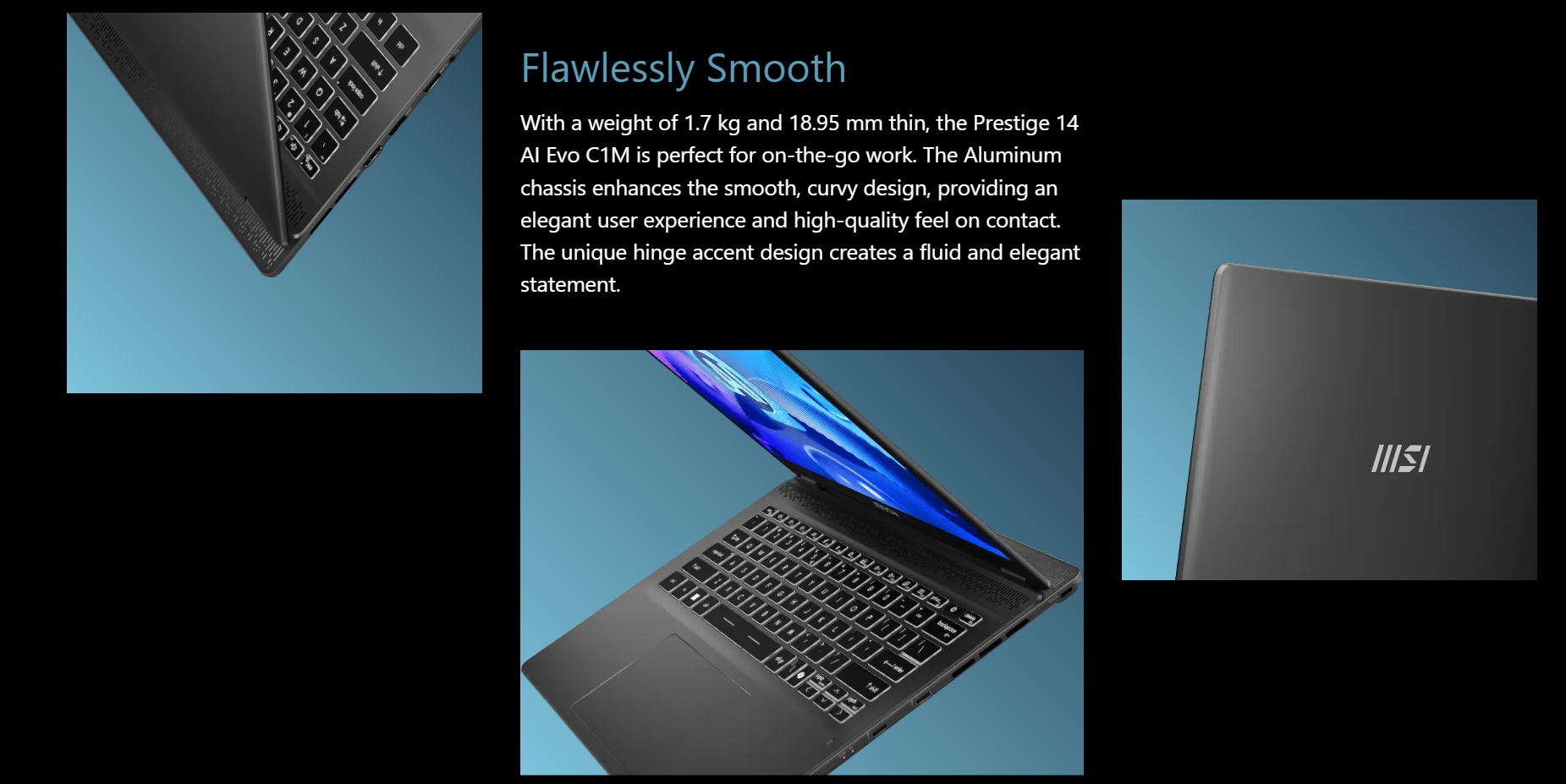 The Prestige 14 AI Evo C1M features ultra-slim bezels and a 16:10 aspect ratio display, allowing for a more spacious visual and workspace compared to standard 16:9 displays, extending your productivity, making it easier to read your creative, spreadsheet, and daily work.
