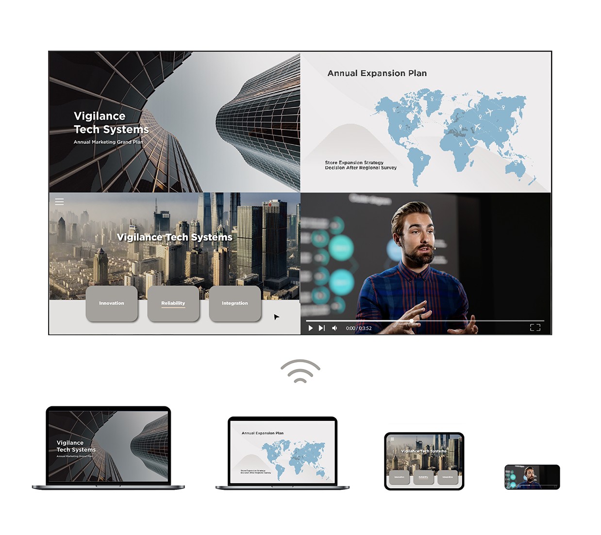 This display delivers seamless content sharing with its intuitive split-screen capabilities, supporting Picture-byPicture (up to 4 sources) and Picture-in-Picture for dynamic collaboration. Additionally, built-in Wi-Fi and the preinstalled vCast™ software allow for effortless wireless content sharing from multiple devices simultaneously, simplifying presentations and enhancing engagement in multi-presenter meetings.