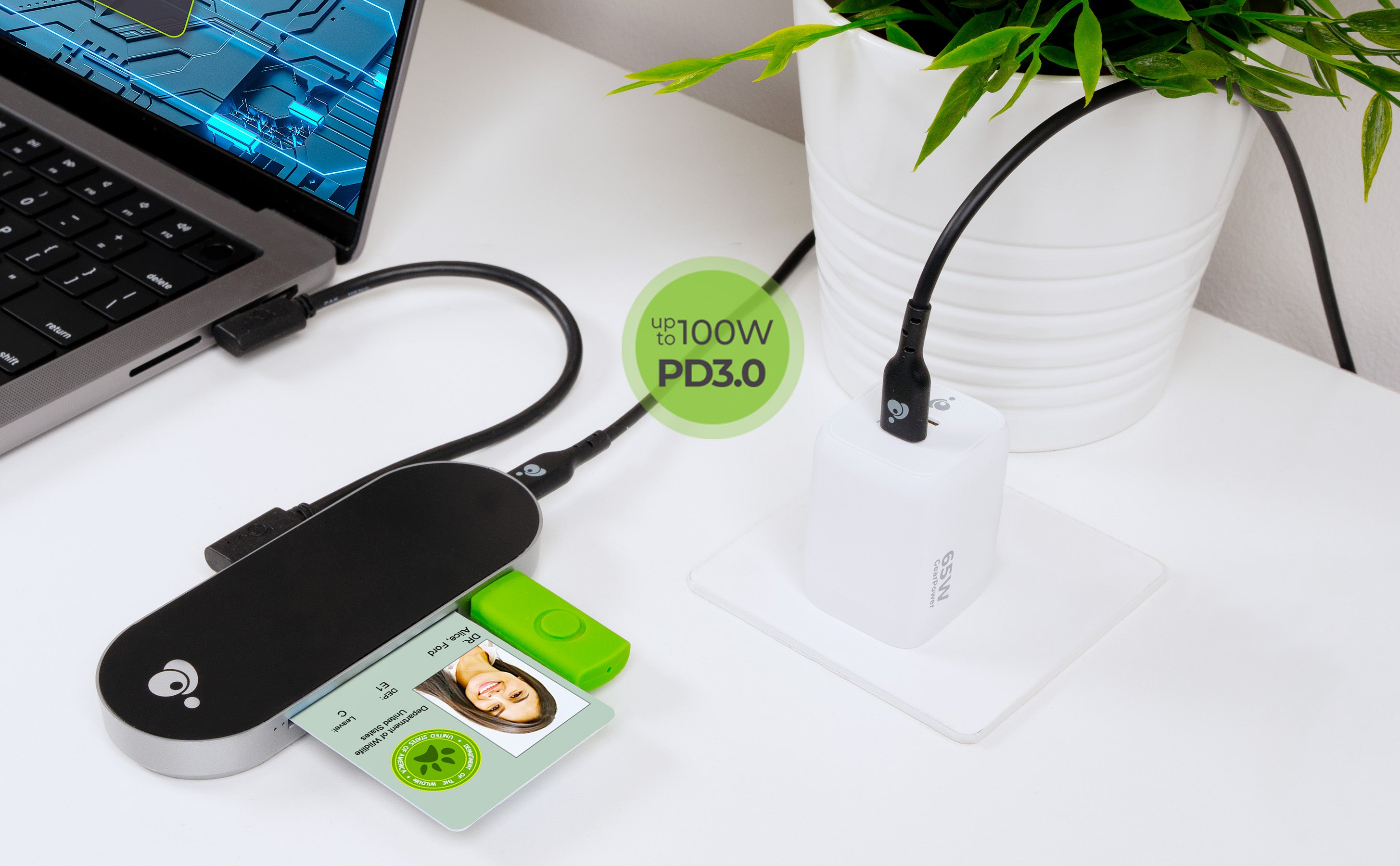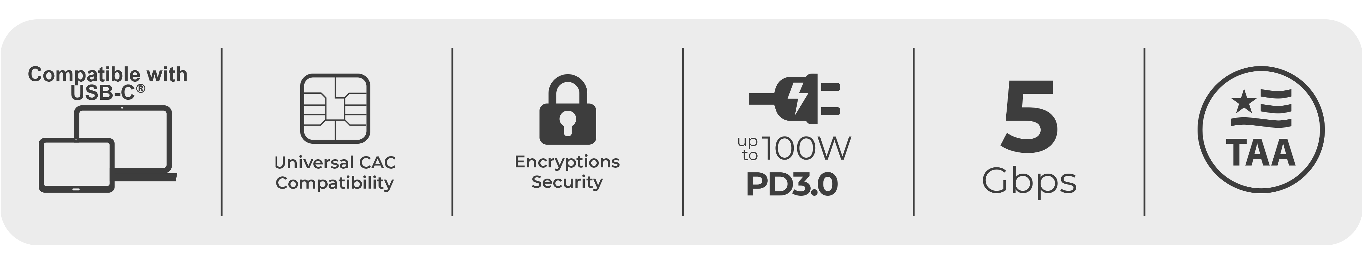 The TAA-certified USB-C Hub w/ PD and CAC Reader is designed for users to remotely access secret or restrictive information in which the users have secure access rights. Access securely stored information on smart cards including pins, passwords, credit cards and family contacts. The CAC reader will end any session automatically if you remove the card or disconnect the reader.
