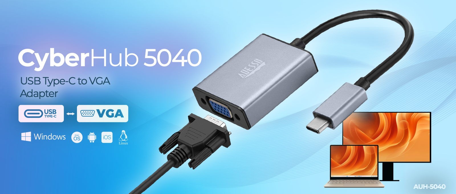 The CyberHub 5040 USB-C to VGA adapter offers modern connectivity to VGA-equipped monitors and projectors, delivering crisp, high-resolution video up to 1920 × 1080 at a smooth 30Hz. It seamlessly connects to modern desktops, laptops, and mobile devices and is the ideal solution for boardrooms, education, and presentation venues.