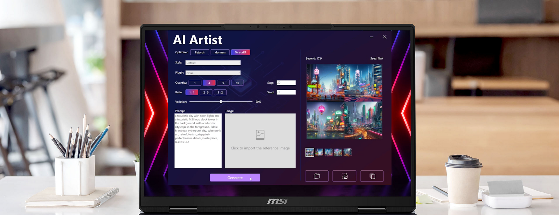 Generate images directly on your laptop with MSI AI Artist. You can create rich images with shorter prompts and generate words within images. MSI AI Artist offers stunning image composition that results in realistic and amazing visuals. Create and inspire at a whole new level.