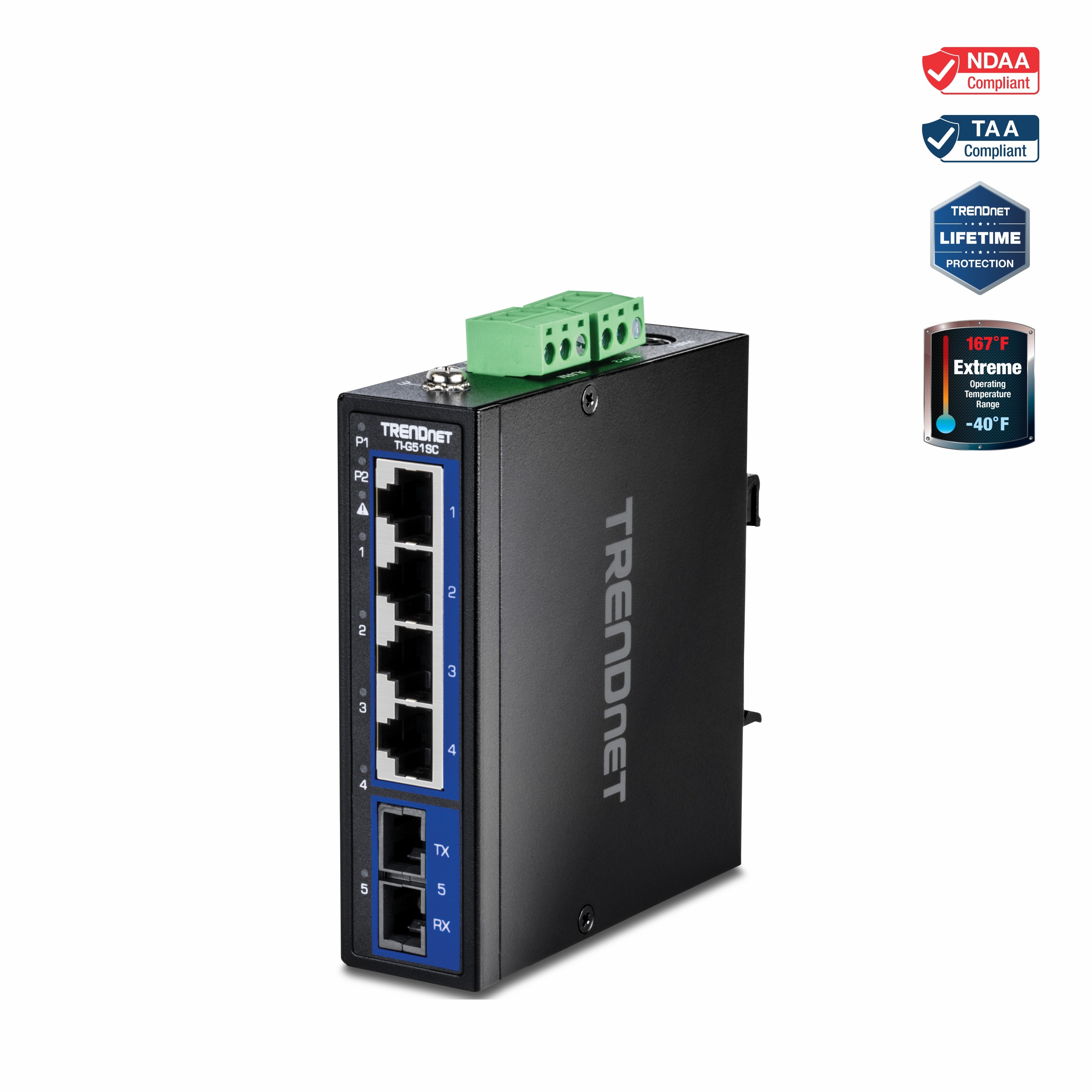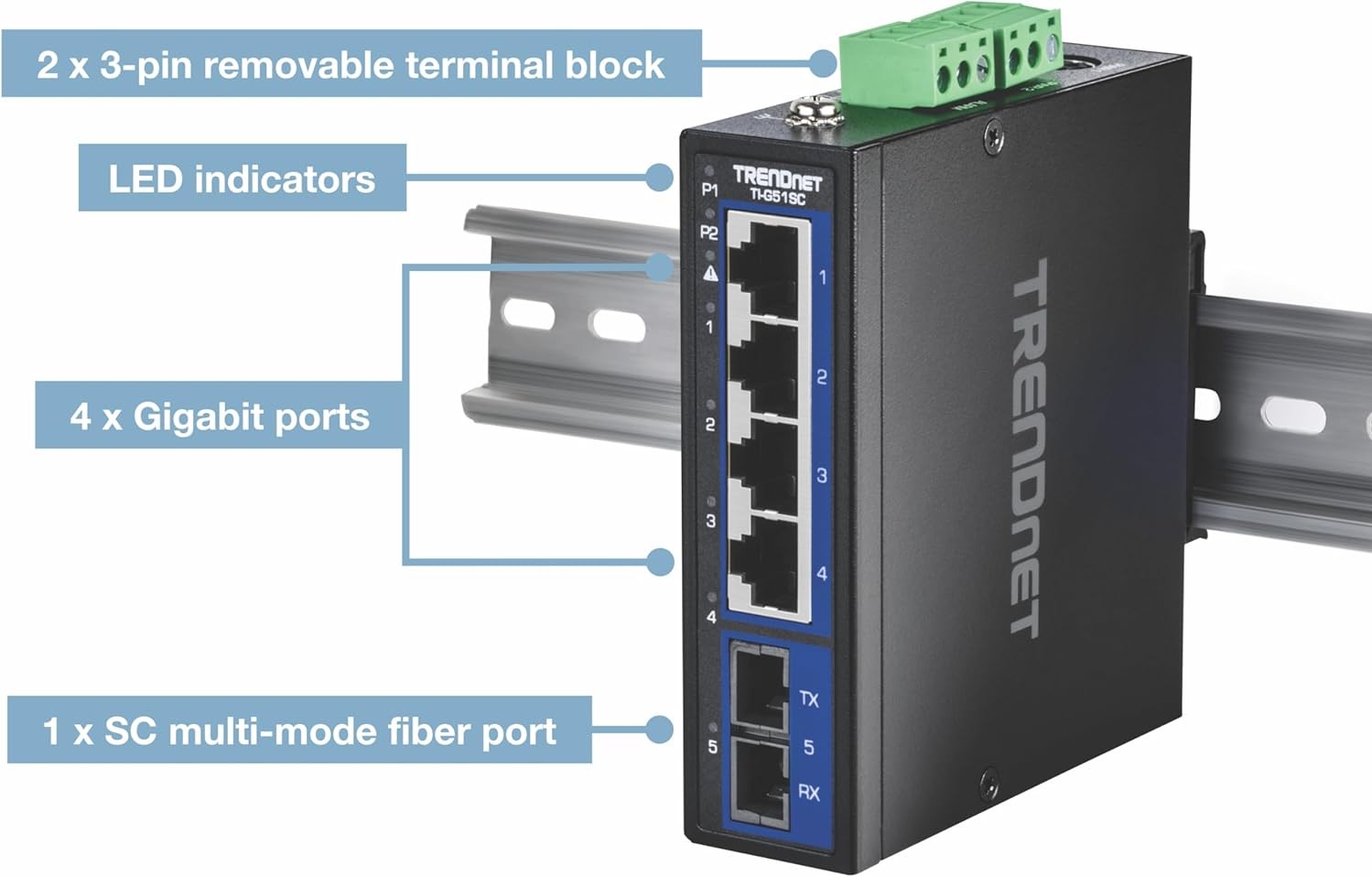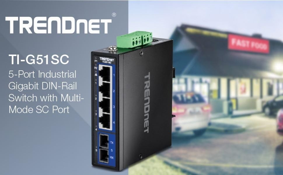 TRENDnet’s 5-Port Industrial Gigabit DIN-Rail Switch with Multi-Mode SC Port, model TI-G51SC, features a rugged IP30 rated metal enclosure and is designed to work in the harshest networking environments. This industrial switch with a fiber port is designed to withstand a high degree of vibration and shock, while operating in both high and low temperatures of industrial environments within - 40° – 75° C (-40° – 167° F). Redundant power inputs with overload current protection on the industrial unmanaged switch minimizes network downtime. This hardened industrial switch features copper gigabit ports for high-speed device connections, and a gigabit multi-mode SC port for long-distance fiber networking applications up to 550 meters.
