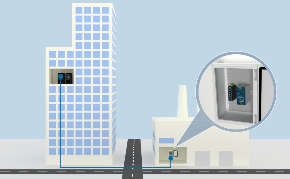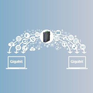 Industrial switch with fiber port features gigabit RJ-45 ports for high-speed device connections, and a gigabit SC multi-mode fiber port that supports long-distance fiber networking applications up to 550 meters