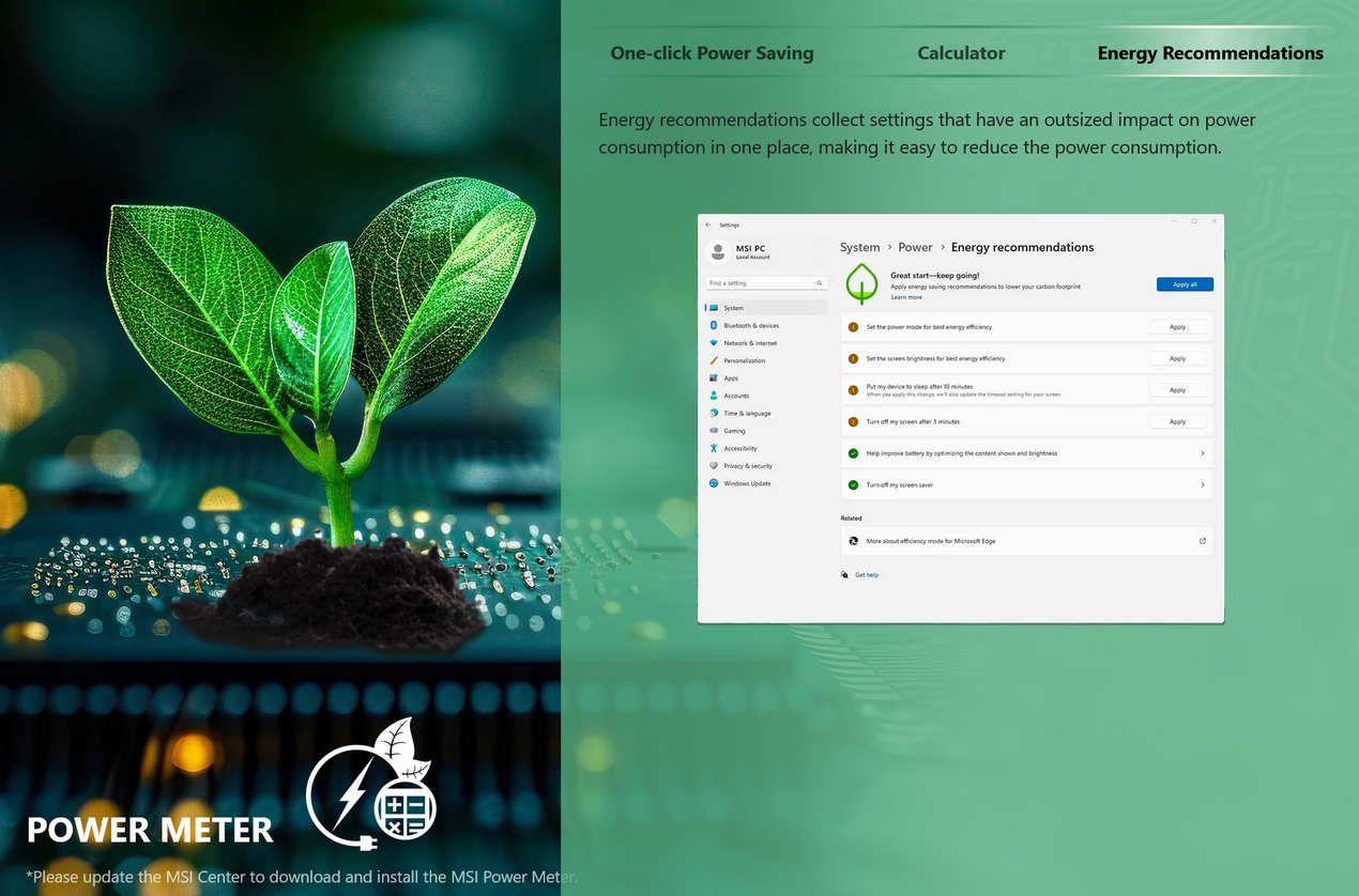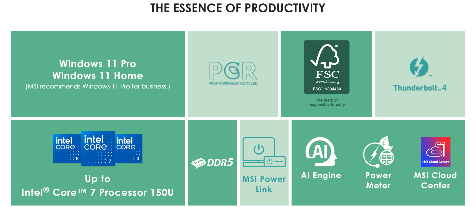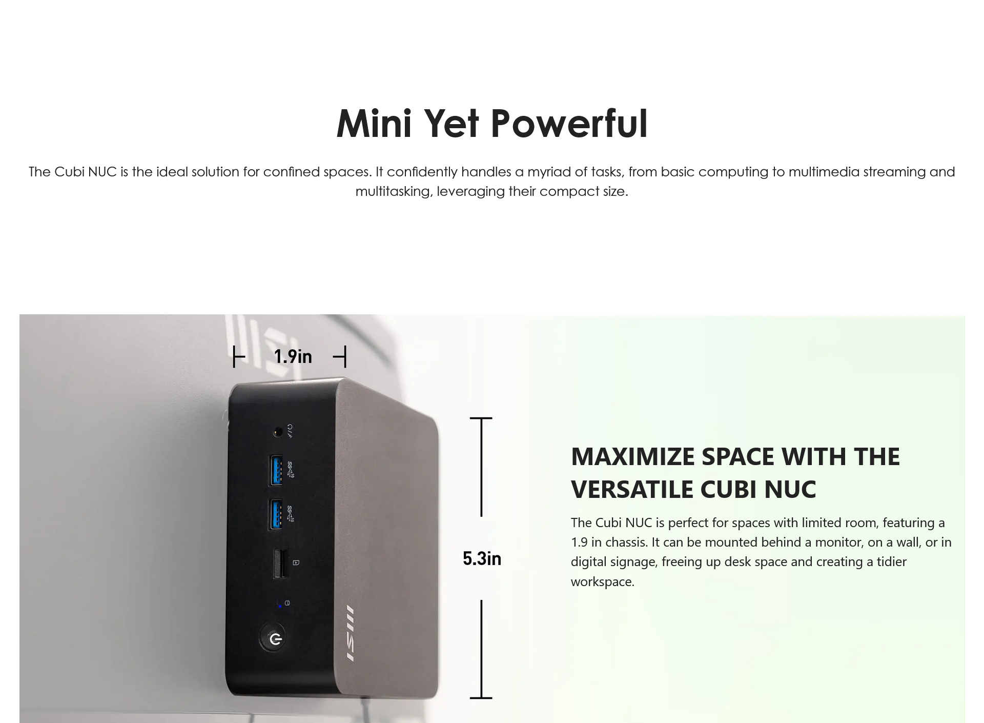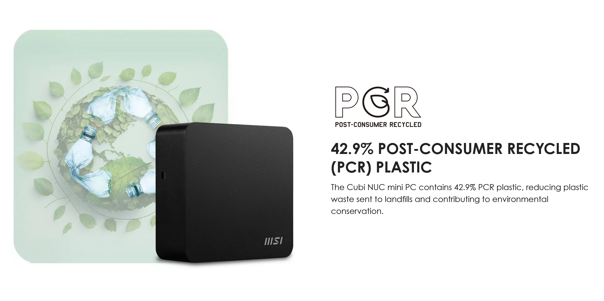 The Cubi NUC Series blends business-centric design with environmental responsibility - an embodiment of MSI's dedication to sustainability. By utilizing green material, PCR (Post-Consumer Recycled) plastic, ensures not only the products' durability but also commits to a greener world.
