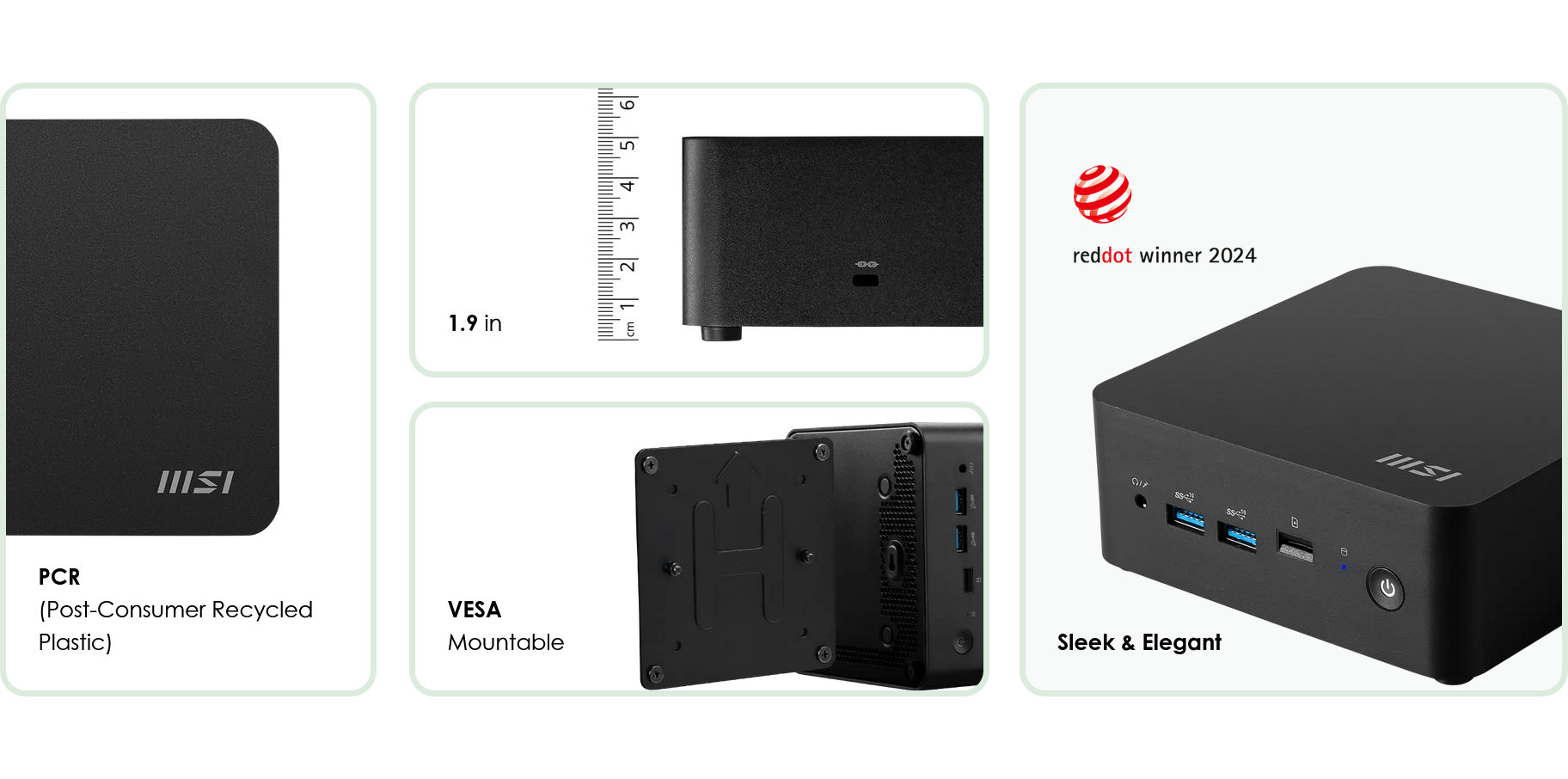 The Cubi NUC Series blends business-centric design with environmental responsibility - an embodiment of MSI's dedication to sustainability. By utilizing green material, PCR (Post-Consumer Recycled) plastic, ensures not only the products' durability but also commits to a greener world.