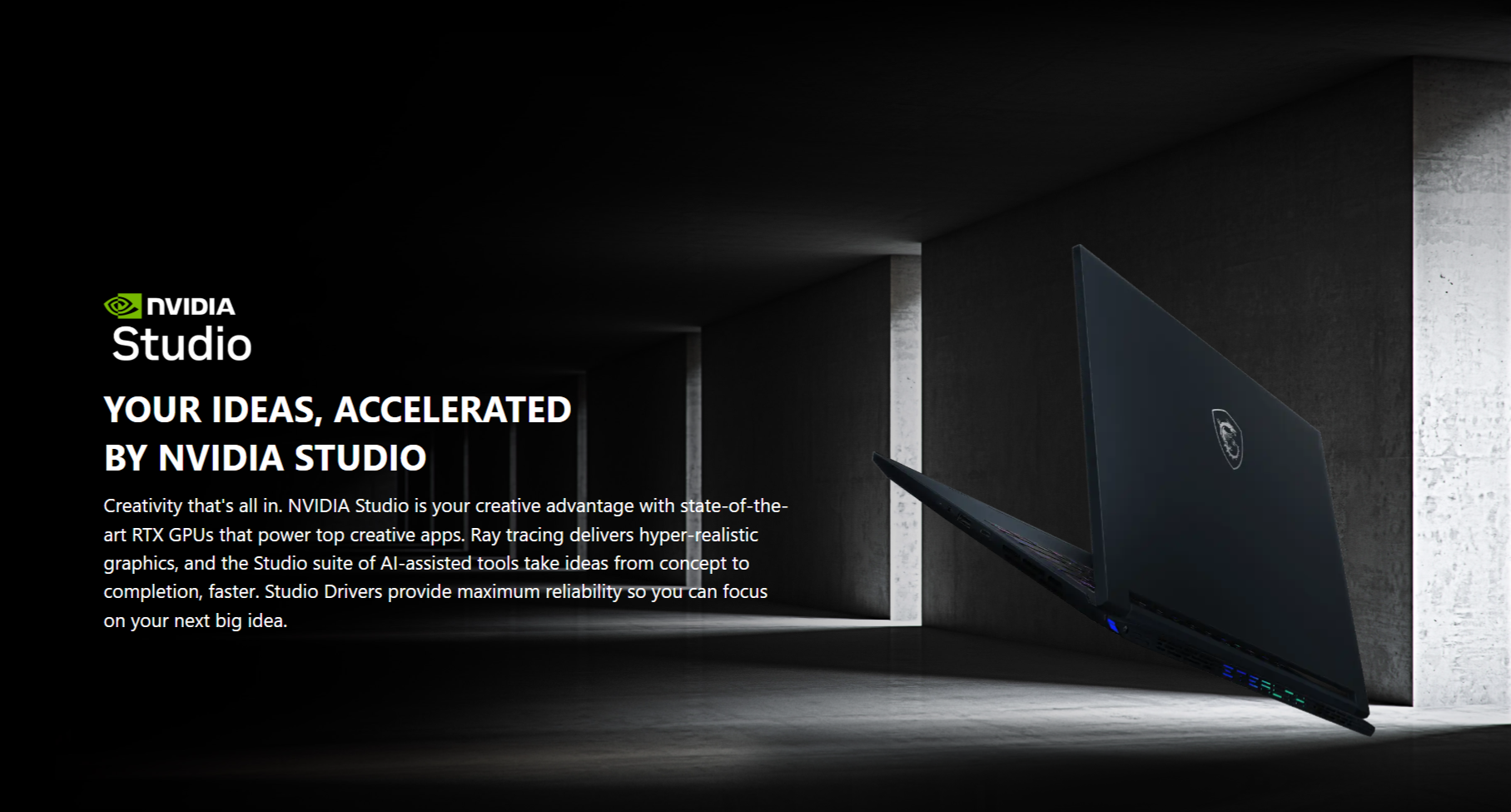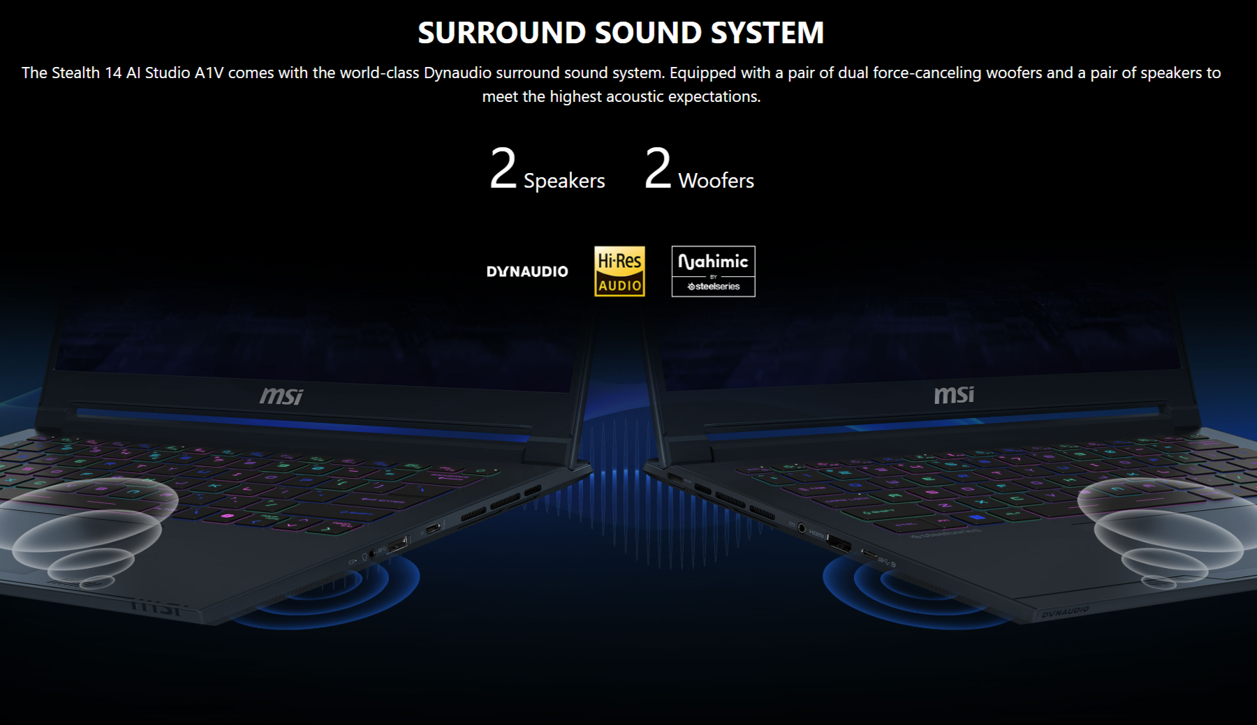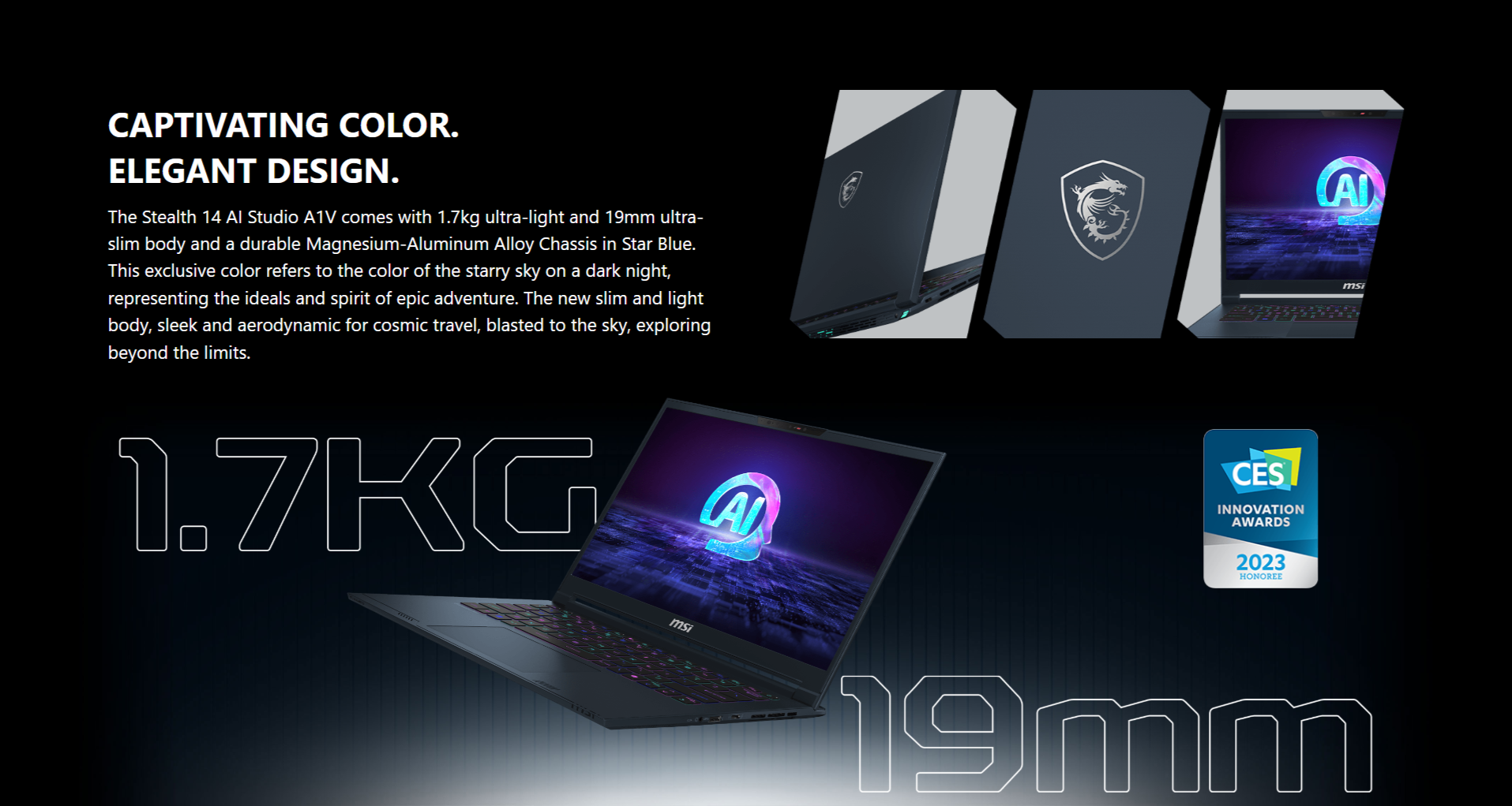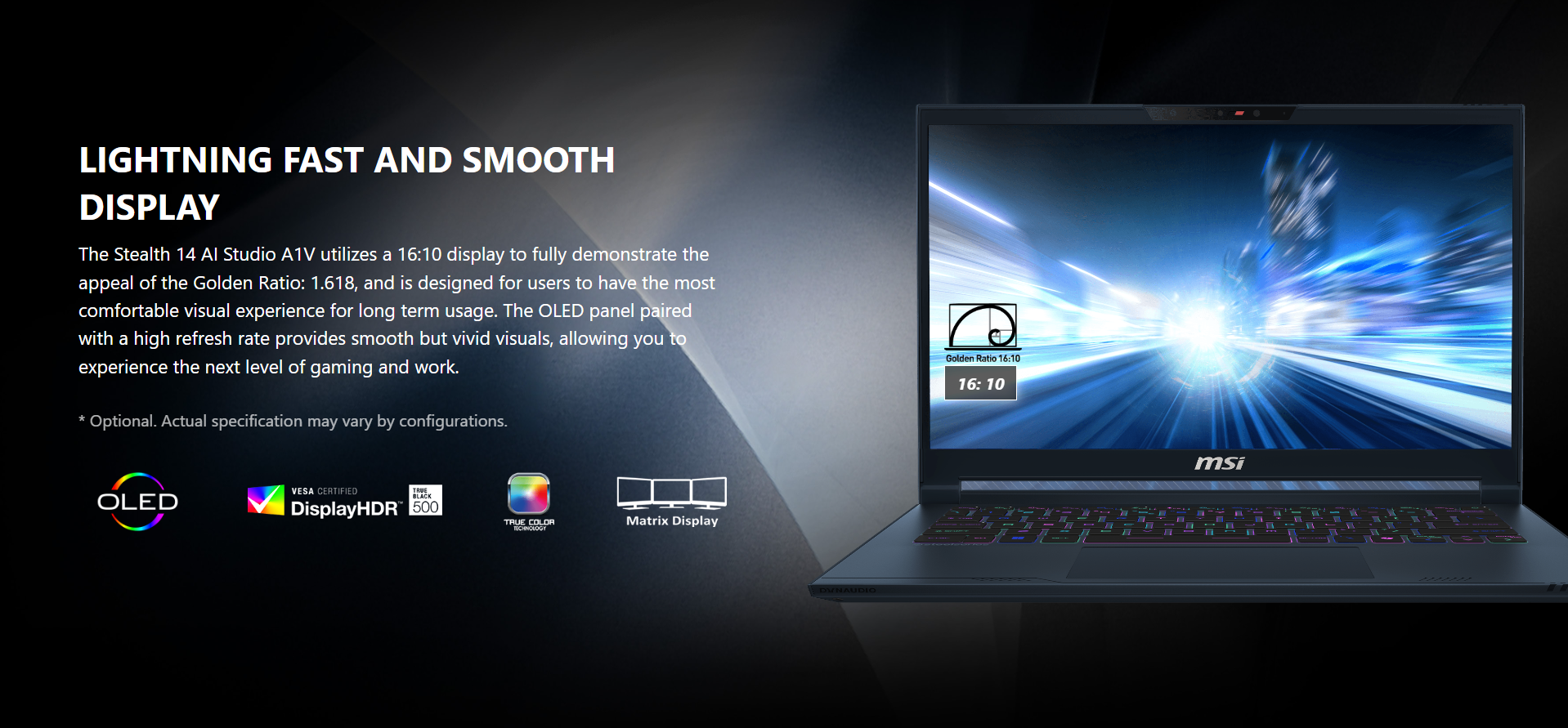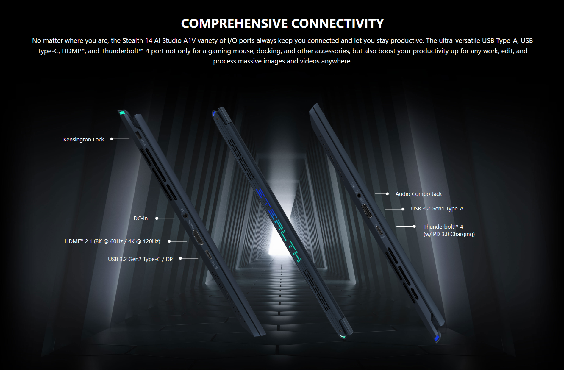 A combination of sharp appearance and excellent performance, the all-new Stealth 14 AI Studio A1V. One second you may be working in a busy city, and the next second you could fall into a gaming battlefield to fight for a win. Succeed at gaming and work, no matter where you go.