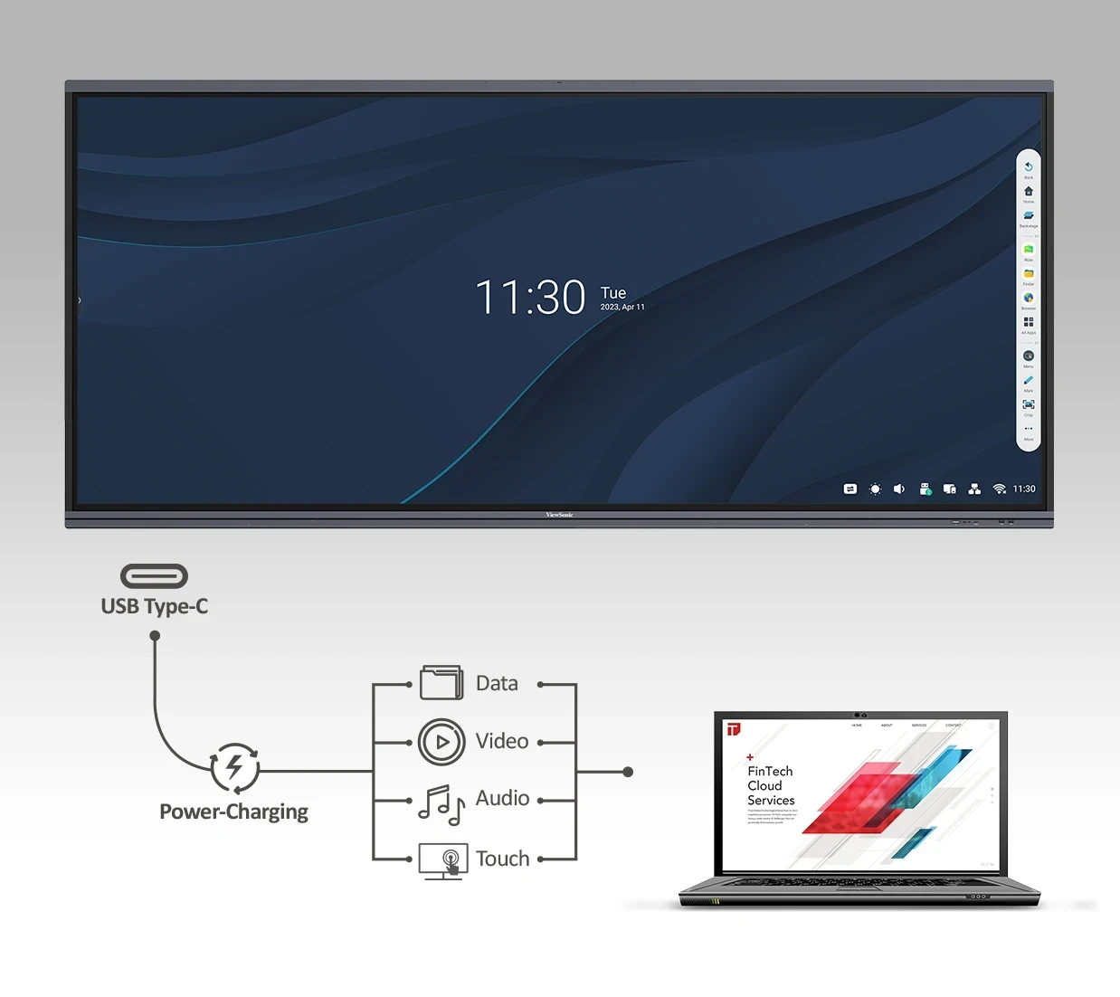 Thanks to USB-C connectivity with up to 100W power delivery, you can easily connect to the ViewBoard display while leaving your devices fully charged. Just plug in your device, present your content on the large screen, then walk away and leave the meeting with a completely charged battery.